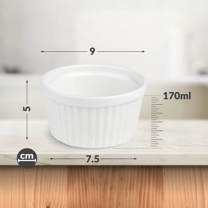 Matériaux sûrs qui peuvent tout gérer Porcelaine de haute qualité : ces porcelaines sont fabriquées en porcelaine durable, sans plomb et non toxique, qui est plus sûre que le plastique ou d'autres matériaux. Selamica Lot De 6 Ramequins En Céramique De 118 Ml Pour Crème. Selamica Lot De 6 Ramequins En Céramique De 118 ... 22 €. Ajouter au panier. Lot De 6... Lot économique et taille appropriée : comprend 10 ramequins carrés en porcelaine blanche de 113,4 g. Dimensions : 8,2 cm de long x 8,2 cm de large x 3,2 cm de haut., Capacité : 113,4 g., Couleur : blanc. Lot Ramequins Carrés Blancs Lot De 10 Ramequins En Porcelaine De 8,9 Cm, Blancs Et Carrés élégants Lot De 10 Ramequins Carrés 118 Ml Blancs Passe au micro-ondes, au four, au congélateur et au lave-vaisselle : peut être facilement et en toute sécurité au lave-vaisselle, et peut être utilisé directement dans le four, le micro-ondes et le congélateur Facile à nettoyer : peut être lavé directement au lave-vaisselle ou à la main avec de l'eau chaude et du savon. Offrez-vous de délicieux plats sans soucis. Parfait pour la cuisson ou le trempage dans votre cuisine, salle à manger, restaurant Ils peuvent être nettoyés au lave-vaisselle facilement ou simplement lavés à la main avec du savon et de l'eau chaude Taille Ramen Lot de 10 nouilles de 118 g. Matériau : porcelaine Petit moule. Design beau et pratique : Matériau de qualité supérieure : fabriqué en porcelaine sans plomb et non toxique. Durable, sans danger pour le congélateur, le micro-ondes, le four et le gril S'empile proprement et économise de l'espace : peut être facilement empilé pour un rangement efficace et économiser de l'espace dans les tables et les armoires. Élégamment conçu : ces ramequins carrés sont conçus dans un souci de style et de fonctionnalité. Kit Creme Brulee ALACASA Raequins En Céraique Avec Couvercles, Lot De 6 Raequins à Ramequin Avec Couvercle