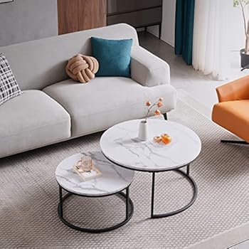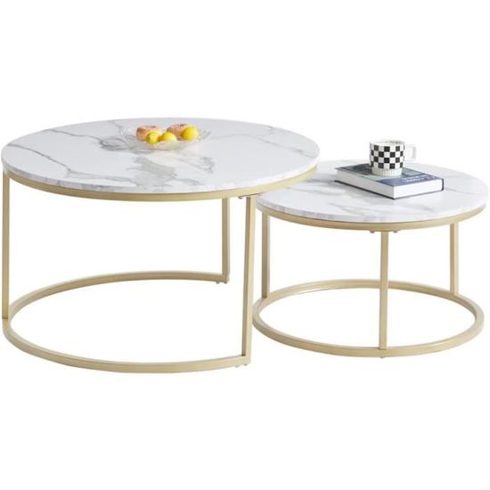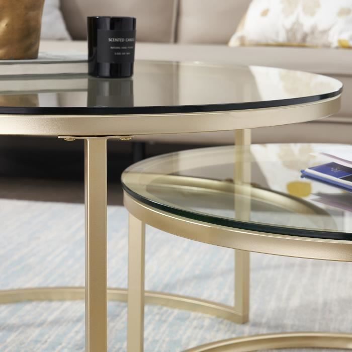 Les pieds en fer doré finement travaillés soulignent le design élégant et assurent stabilité et durabilité. Les coins arrondis minimisent les risques de blessures et s'adaptent parfaitement aux concepts de maison modernes, légers et de luxe et nordiques – que ce soit comme table basse ronde blanche ou comme table de salon ronde élégante. Polyvalente : utilisée séparément, la table devient un meuble pratique 3 en 1 : table basse, table d'appoint ou support de fleurs. Combinaison de verre trempé et de pieds en métal : le verre trempé robuste à haute opacité offre une résistance exceptionnelle aux chocs et à l'abrasion. Lot De 2 Tables Basses Rondes Gigognes Empilables Noir Gris - Table basse Design nordique simple : conçue dans un style scandinave, la table apporte une touche simple et élégante à votre intérieur. Combinable de manière flexible, empilable et adaptée à différentes pièces grâce à ce lot de 2., Fabrication de qualité supérieure et design élégant pour chaque maison. HOMCOM Lot de 2 tables basses rondes gigogne empilables plateau MDF... Les plateaux de table combinables sont parfaits pour des tours confortables avec jusqu'à 8 personnes – une table basse ronde polyvalente avec fonctionnalité et style. Matériau : plateau de table en verre trempé + cadre doré., Charge maximale : 50 kg. Design peu encombrant : grâce à la structure astucieuse imbriquée, les grandes et petites tables basses rondes peuvent être combinées de manière flexible ou empilées pour économiser de l'espace. Table Basse Ronde Gigogne GrandCA HOME Lot De 2 Tables Basses Rondes Gigognes Avec Cadre En Métal Table Basse Ronde Marbre Description du produit ; Couleur : Blanc et doré ; Matériau : MDF et acier ; Dimensions : Grande table ; Petite table, 45,5 x 60 x 39,5 cm ; Étagère de petite table... Design de table double bien pensé : la combinaison de la table haute et basse permet aux enfants de jouer de manière créative tandis que les adultes déposent des boissons confortablement.