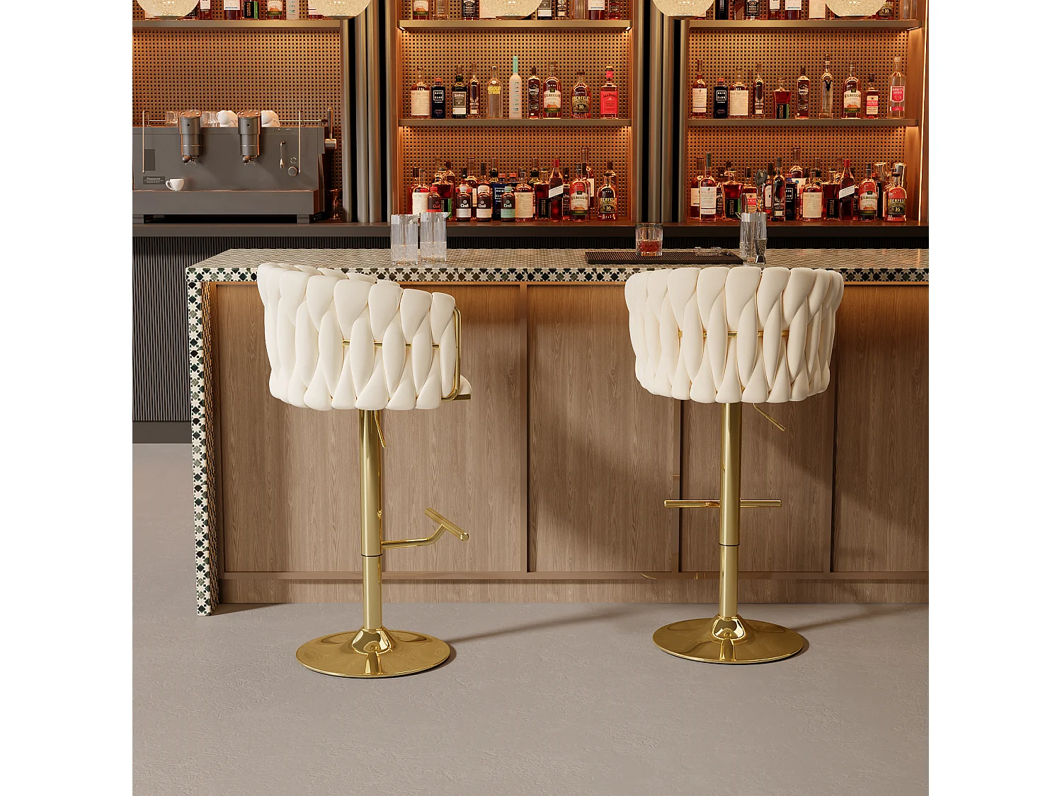 EXPERIENCE CONFORTABLE: Le coussin rempli d'éponge de haute densité est épais et plein, avec du velours enveloppant la surface pour assurer une expérience confortable de longue durée. En raison des différentes méthodes de mesure, les dimensions peuvent présenter une erreur de 1-3 cm., Structure : Métal, Surface : Velours Tabouret Bar Réglable Lot De 2 Tabourets De Bar Pivotants Modernes Avec Dossier Doré Meuble Bar Lot de 2 tabourets de bar, pivotante, hauteur réglable, pied en metal, 40x42x81-102.9cm, beige... Les couleurs peuvent varier légèrement en fonction des paramètres de l'écran et des conditions d'éclairage. Son élégance vintage confère une ambiance douce à chaque espace et s'intègre harmonieusement à l'environnement. Dimensions totales (cm) : 36 * 51 * 85,5-106,5 (P * L * H)., Quantité : 2/4 pcs , Poids : 16., 5 kg , Poids maximum : 250 lbs Son design raffiné complète tout style décoratif. Disponible en 7 couleurs !, Ce tabouret de cuisine allie un langage des formes minimaliste à un style de vie moderne. ADJUSTABLE & 360° SWIVEL: Cette chaise haute bar est réglable en hauteur pour s'adapter à toutes les hauteurs de comptoir ou de table. Support Stable & Repose-pieds Confortable En tissu, résistant à l'usure et respirant, doux pour la peau et doux. Le dossier s'adapte à la forme du corps humain, et le coussin de siège rempli de mousse... DESIGN MODERNE ET ELEGANT: La base en métal or combinée au dossier à découpe unique et aérodynamique ajoute une élégance contemporaine à votre espace intérieur. Profitez d'une rotation à 360° pour une mobilité totale et un repose-pieds intégré en métal garantit un confort optimal. Tabouret de Bar Pivotant Réglable en Hauteur Set De 2 Chaises, Pivotantes à 360°, Réglables En Hauteur Avec Repose Pieds Velours Rose Et Argent 83187192