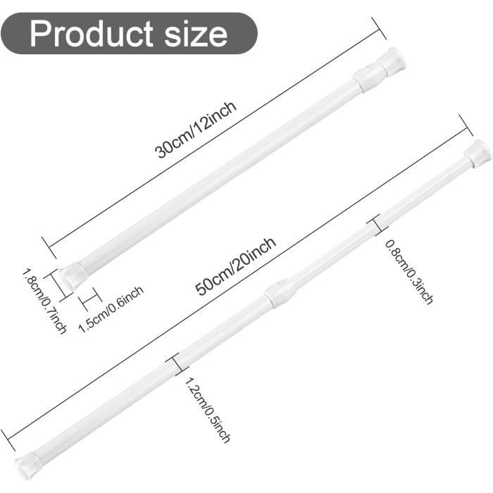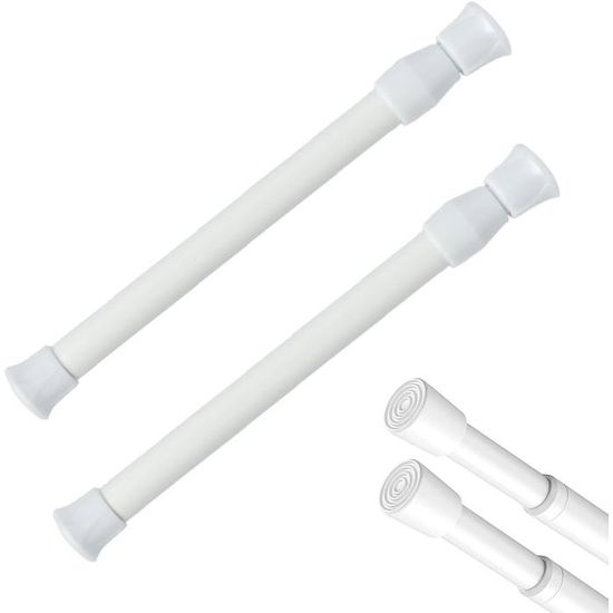 Lot de 2 tringles à rideaux réglables, télescopiques, sans perçage Longueur réglable : 2 barres avec longueur réglable (30 à 50 cm). 30 à 50 Cm Réglable Lot De 2 Tringles à Rideaux Sans Perçage, Tringle Rideau Plafond Sans Percage, Tringle à Rideau Tringle Ajustable 30-50 Cm Construction de qualité supérieure - Fabriqué en acier au carbone robuste avec surface laquée. Ce lot de 2 tringles à rideau de douche télescopiques est conçu pour s'adapter à divers espaces tels que la salle de bain, la cabine de douche, la baignoire, le vestiaire, le placard et même les fenêtres Tringle Extensible de 40 à 55 cm pour Rideau de Douche, Ensemble de... Nettoyage facile - Démontable et essuyable. N'abîme pas les murs, les portes et les fenêtres. Pratique pour les espaces restreints et l'entretien régulier. Réglable de 30 à 50 cm - S'adapte parfaitement à différentes fenêtres, portes et niches., 3., Extrêmement stable pour les rideaux lourds. Utilisation polyvalente : idéale comme tringle à rideau, paroi de douche, porte-vêtements ou tringle d'étagère. 2 barres de serrage (30 à 50 cm) - Montage sans perçage - Acier au carbone robuste - Embouts en caoutchouc antidérapants Les 3 principaux avantages : 1., Pas de trous de perçage - Montage facile.