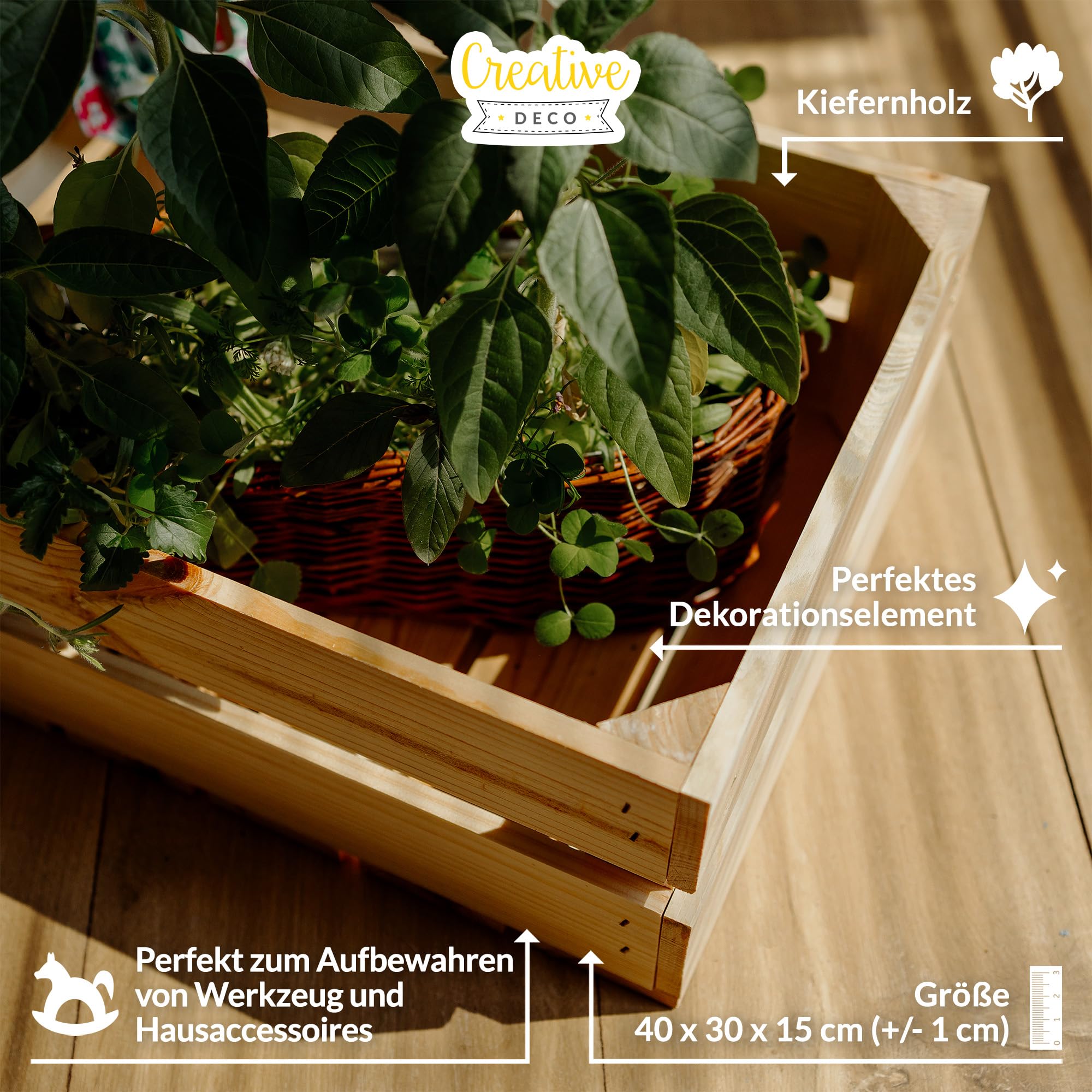 Pour cela, vous pouvez facilement retirer l'insert en plastique. Lot 3 Caisses Bois 22x11x10 Cm Lot De 3 Caisses En Bois - Blanchi Lot 3 Caisses Rangement Elles peuvent être décorées avec des herbes aromatiques, des fleurs ou servir de rangement pour des objets divers, etc. Embellissez votre maison et votre jardin avec nos caisses en bois. Détails du produit : matériau : bois., Longueur : environ 22 cm., Largeur : environ 11 cm., Hauteur : environ 10 cm. Caisses à fleurs : nos caisses en bois sont équipées d'un insert en plastique pour pouvoir les utiliser comme jardinière et pot de fleurs. Lot de 3 caisses en bois empilables décoratives en bois pour le rangement, la décoration de la maison, les boîtes avec poignées découpées, la décoration de la ferme, les travaux manuels vintage Nos caisses en bois sont doublées d'un insert en plastique étanche pour pouvoir les utiliser comme jardinière et pot de fleurs. Que ce soit comme lieu de rangement ou comme décoration avec des fleurs, ces caisses sont peu encombrantes et ont un bel aspect. Placez ces caisses à fleurs dans le jardin, sur le balcon ou dans l'appartement et profitez de vos fleurs préférées. En particulier dans le jardin et sur le balcon, vous pouvez créer une atmosphère magique. Dimensions : longueur : environ 22 cm, largeur : environ 11 cm, hauteur : environ 10 cm. Caisses à fleurs : nos caisses en bois sont équipées d'un insert en plastique pour pouvoir les utiliser comme jardinière et pot de fleurs. Ainsi, pas de fuites d'eau lors de l'arrosage des fleurs et des herbes aromatiques Casse en bos 63x63 H.63cm mputrescble Capacté 166 Ltres BLANC... Leur belle finition fait des caisses en bois elle-même un objet de décoration. Ainsi, pas de fuites d'eau lors de l'arrosage des fleurs et des herbes aromatiques. Elles s'adaptent parfaitement à tout intérieur de style vintage, maison de campagne ou shabby chic. Lot de 3 caisses décoratives UNUS GARDEN, en bois, 22 x 11 x 10 cm, boîte à fleurs, de rangement.