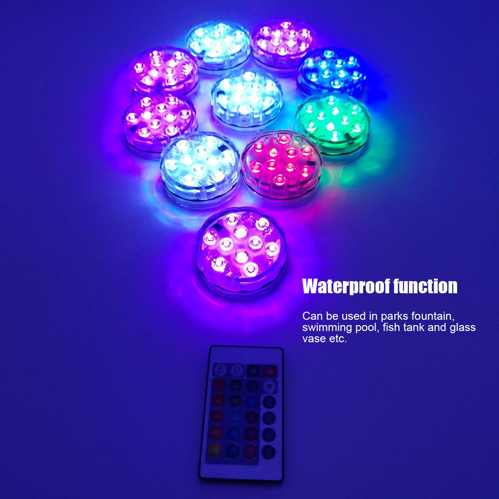 Lot De 2 Lampes De Piscine, Lampes LED Submersibles Rechargeables Avec Telecommande Lampe Led Rvb Submersible Pour Piscine Etancheite Ip68 96510787 4 lampes solaires de piscine étanches,lampes LED submersibles à énergie... Lampes LED Submersibles Lot De 4 étanches Pour Piscine Sous-marine, 16 Led Patin A Glace Lumières LED avec télécommande : 16 modes statiques différents, appuyez sur le bouton de couleur de la télécommande pour obtenir la couleur associée, la télécommande et les lumières LED pour maintenir la distance à moins de 20 mètres. Lorsque les lumières sont faibles, la télécommande ne peut pas très bien contrôler, ne vous inquiétez pas, il suffit de changer les piles des lumières., en fonctionnement. Lampes Led submersibles étanches pour jacuzzi, spa, piscine, lumières... Assurez-vous simplement que le lanceur et le récepteur doivent être dans la même direction. 【Alimenté par piles】: les lampes de piscine avec 10 lumières LED lumineuses fonctionnent avec 3 piles AAA, elles fonctionneront de 10 à 12 heures, faciles à remplacer. Convient également pour un mariage, une fête, une scène, Halloween, Noël, une discothèque, un centre commercial, un magasin de bijoux, une salle d'exposition, une vitrine, un noyau, une armoire, un musée, une boutique, un aquarium, une ampoule domestique, etc. Multifonction : les lumières de piscine étanches peuvent être utilisées pour l'éclairage de fête/événement, éclairage d'accentuation de vacances, éclairage d'intérieur et d'extérieur, éclairage d'accentuation de la maison, design floral, couverture transparente, design d'événement.