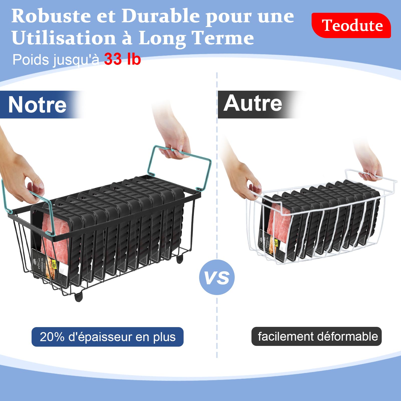 Accès Rapide, pas Besoin de Fouiller : Il suffit de soulever la poignée pour retirer le panier congélateur coffre, même de l'étagère la plus basse. UMDONX 4 Pièces Paniers de CongéLateur Coffre - Poignée Empilable Paniers de congélation,accès facile, pour 198L congélateur,Organiser les ingrédients... Vue d'Ensemble Rapide, Accès Facile : Le panier congelateur, au design innovant, comprend des paniers empilables qui coulissent d'une simple pression sur la poignée, révélant sans effort les articles stockés en dessous. Le panier congélateur coffre permet d'éviter d'oublier des stocks et de réduire efficacement le gaspillage alimentaire. Panier Fil Métallique 8kg Panier Métallique 37x18cm Lot De 4 Paniers Congélation Empilables 37x18x15cm - Organisation Congélateur Coffre 198L Rangement Surgelés Organisateur Congélateur 198 Litres Le bac congélateur s'adapte parfaitement à diverses catégories d'aliments tels que la viande, les légumes surgelés et les glaces, garantissant ainsi que votre congélateur reste propre et bien rangé. Chaque organisateur congelateur supporte jusqu'à 8 kg et ne se déforme pas, même sous le poids de paquets de viande ou de légumes lourds. Organisez Efficacement vos Aliments Congelés : Utilisez le organisateur congélateur pour placer les articles plus anciens ou ouverts sur l'étagère supérieure et les aliments frais sur l'étagère inférieure, afin d'éviter que les articles ne soient enfouis au fond du congélateur et difficiles à trouver. Dites adieu aux fouilles dans les congélateurs encombrés : il vous suffit de réempiler le panier congelateur coffre pour gérer efficacement votre inventaire. Performances de Congélation Optimisées, Fraîcheur Prolongée : La structure en treillis métallique favorise la circulation de l'air, garantissant une circulation efficace de l'air froid dans tous les coins. Premier Entré, Premier Sorti (FIFO) et Contrôle Total : Classez intelligemment les aliments par date, les plus anciens en haut, les plus récents en bas. Tout est à portée de vue ! Congélateur coffre blanc capacité 567 litres à 1 couvercle et 3 paniers... Rangez vos fruits, légumes, conserves, snacks ou boissons de manière ordonnée et à portée de main. Organisez vos fruits, légumes, snacks, boissons, conserves ou viandes congelées : il devient un accessoire de cuisine multifonctionnel indispensable. Yallmie 4 Pièces Panier Congelateur Coffre, 37,2X18,8X14cm
