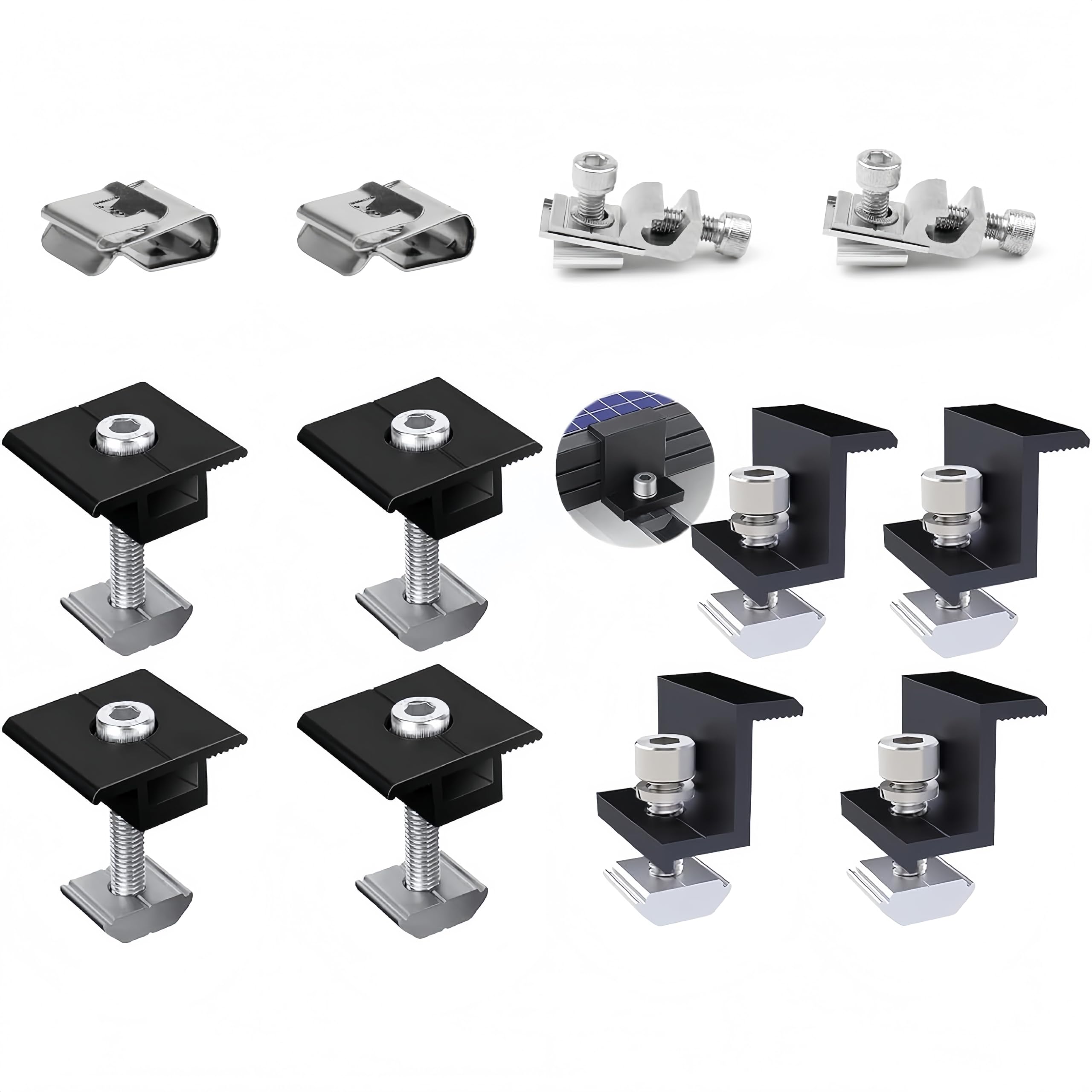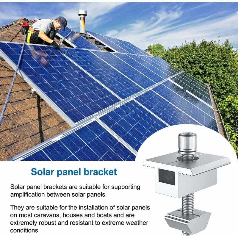 Polyvalent : le support de panneau solaire est adapté à diverses installations photovoltaïques en plein air. Pinces Centrale Extrémité Terre Lot De 4 Supports De Panneau Solaire - Bornes D'extrémité De 30 Mm Pinces Centrales Et D'extrémité Solaire (Remarque : les rails ne sont pas inclus) Kit complet : 4 bornes centrales de panneau solaire de 30 mm et 4 bornes d'extrémité avec accessoires complets pour le montage, y compris 2 bornes de terre M8 et 2 serre-câbles. Les bornes d'extrémité sont universelles et compatibles avec différents systèmes de panneaux solaires encadrés. Matériau de qualité supérieure, durable et durable : le kit de support de panneau solaire de 30 mm est fabriqué en alliage d'aluminium, qui présente les avantages de résistance à la corrosion et de durabilité, et est résistant à la rouille et aux intempéries, pas facile à casser, à déformer ou à plier. Lot de 10 supports de fixation pour panneau solaire En connectant le panneau solaire et en le fixant sur la piste, assurez-vous que les panneaux sont installés dans la bonne position et orientation. Caractéristiques techniques : Nom : support de panneau solaire bornes d'extrémité 30 mm noir , Matériau : aluminium. Fixation sûre : ce support de panneau solaire est conçu pour fixer les panneaux solaires en toute sécurité sur les rails et créer une connexion stable entre les panneaux. Jeu de pinces solaires de 30 mm : les kits de bornes d'extrémité et centrale noires sont utilisées pour fixer les modules au système de rail et créer une connexion solide entre les modules de 30 mm d'épaisseur. La connexion entre les panneaux solaires peut être facilement réalisée. Kit de panneau solaire - GOTOTOP - 30W - Silicium Monocristallin... Lot de 12 pinces de fixation pour panneau solaire - 35 - Réglable... Les supports de panneau solaire sont équipés de vis et d'écrous, une installation rapide peut être fixée à la surface d'installation. Design stable en Z : le design en forme de Z spécialement conçu permet une dissipation efficace de la chaleur et assure un environnement d'installation propre et bien organisé. 2 pinces de mise à la terre M8., 2 serre-câbles. Caractéristiques du produit : Matériau de haute qualité : le support de panneau solaire est fabriqué en alliage d'aluminium à haute résistance avec une surface anodisée, ce qui assure une excellente résistance à la corrosion et une longue durée de vie.