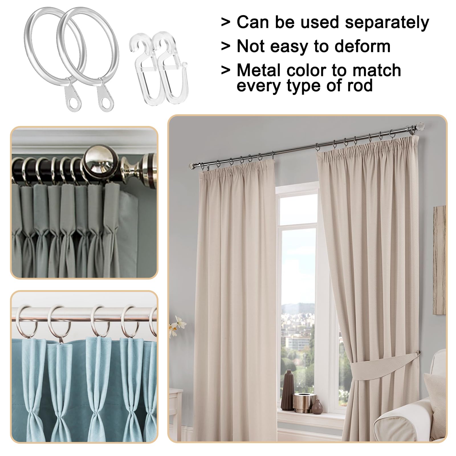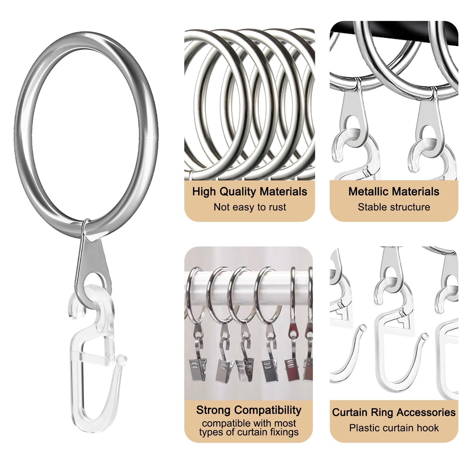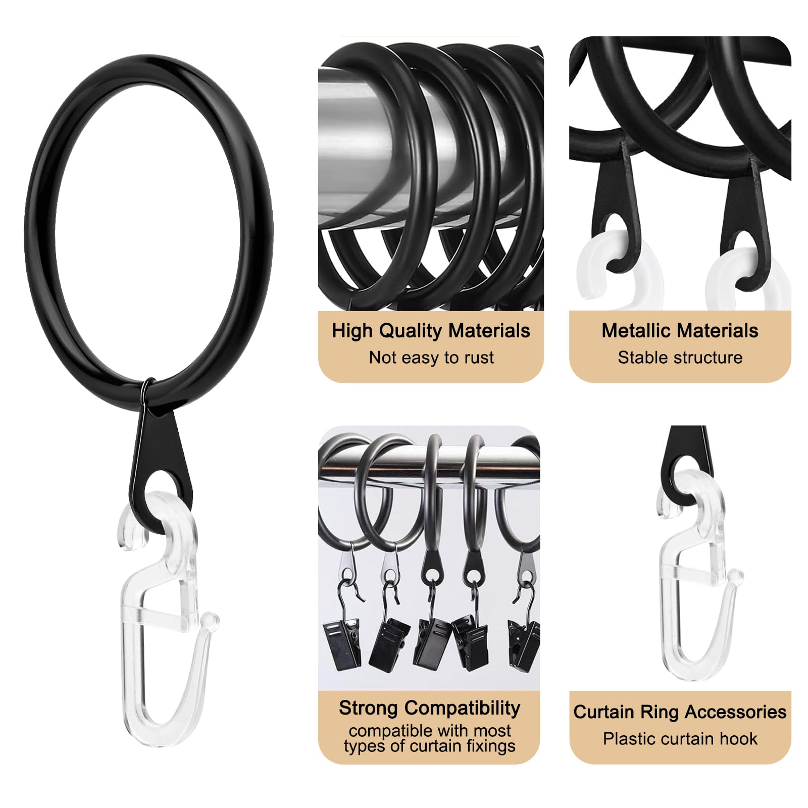 YOYEAH Lot de 40 crochets et anneaux de rideaux, en métal et Ajustement parfait et polyvalent : le diamètre intérieur de l'anneau de rideau est de 30 mm à 1,18 pouces, s'adapte à moins de 27 mm à 1,1 pouces de tringles de rideau, veuillez noter la taille lors de l'achat. Anneaux De Rideau Lot De 40 Et 40 Crochets En Plastique - En Anneaux Rideau Métal Avec Crochets Parfaitement combinés pour une suspension facile et une utilisation durable - Idéal comme accessoire de tringle à rideau pour la maison, l'hôtel ou les événements. Ajustement parfait et polyvalent : le diamètre intérieur de l'anneau de rideau est de 30 mm à 1,18 pouces, s'adapte à moins de 27 mm à 1,1 pouces de tringles de rideau, veuillez noter la taille lors de l'achat Lot de 40 anneaux de tringles à rideau à suspendre – Diamètre intérieur... Sûr et respectueux de l'environnement : les anneaux et crochets de rideau sont magnifiquement polis et ont une surface lisse qui ne se déforme pas facilement et ne gratte pas les doigts et ne coince pas le cordon de rideau, ce qui le rend flexible et sûr. La taille du crochet de rideau pour rideaux en métal est d'environ 28 x 12 mm. Pas de rayures ou de tiraillements grâce à sa surface lisse. Cadeau idéal pour les amateurs de ménage. Convient pour les tringles à rideaux noires, les rideaux français, les rideaux de douche ou la décoration de la pièce - Conçu sur mesure pour la plupart des types de rideaux. Contient suffisamment d'anneaux de rideau avec clips pour les besoins de rechange ou plusieurs pièces.