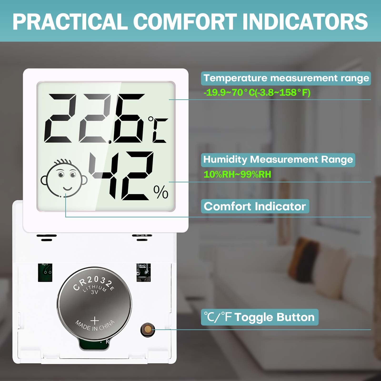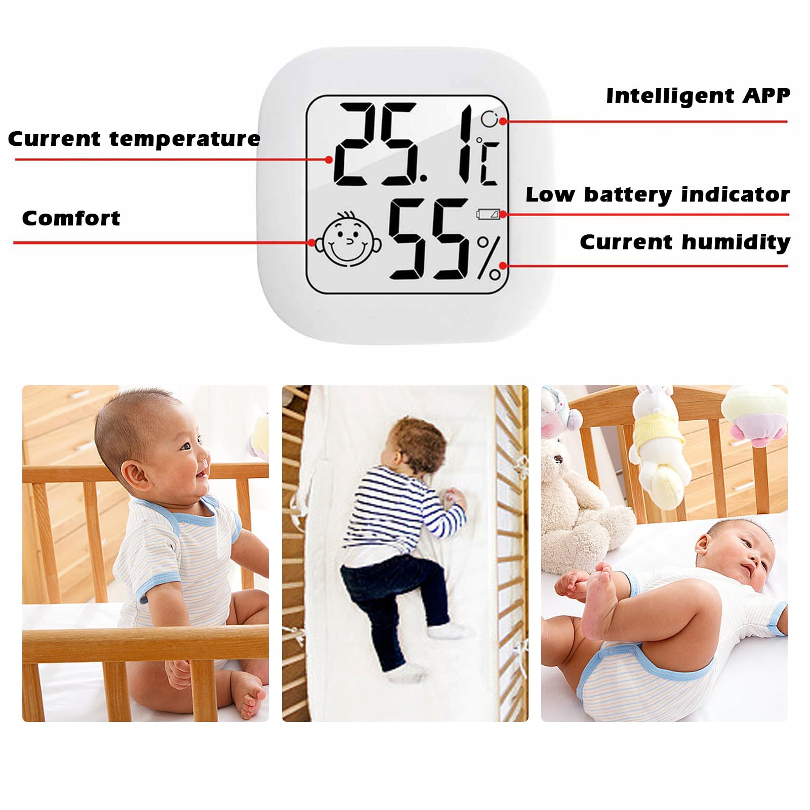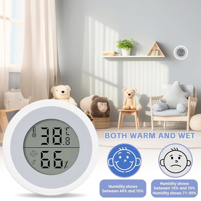 1 manuel d'utilisation (français non garanti)., Remarque : 1., Pour garantir une mesure précise de la température, placez les appareils à l'abri de la lumière directe du soleil et loin des sources de chaleur ou des fentes d'aération., 2., En raison de la mesure manuelle et des différents angles de lumière, il peut y avoir des erreurs de taille et de légères différences de couleur., 3., Si vous avez des questions sur le produit, veuillez nous contacter dès que possible Le mini thermomètre hygromètre intérieur avec indicateur de confort pratique - Emoji vif vous aide à comprendre immédiatement l'humidité de l'air. Dimensions : 4,4 x 4,4 x 0,9 cm Poids : 0,95 kg. Contenu de la livraison : 6 mini thermomètres hygromètres intérieurs., 6 piles bouton CR2032., 6 autocollants muraux. Plage de température mesurable : de -19,9 à 70 °C. Précision de mesure d'humidité : ± 5 % RH. Petite mais longue durée de vie de la batterie - Ce mini thermomètre hygromètre (5,0 x 3,5 x 1,3 cm, ne pèse que 24... Protège votre famille contre le froid, la peau sèche, l'asthme, les allergies et la formation de moisissures Résolution de la température : 0,1 °C. Ce mini thermomètre hygromètre portable d'intérieur mesure l'humidité et la température intérieure et vous aide à connaître les conditions de l'air ambiant. Hygromètre Chambre Bébé Bureau Sonde Confort Ambiant Thermomètre Hygromètre Numérique Lot De 6 - Mini Station Météo Avec Smileys - Pour Maison, Bureau, Chambre Bébé Thermomètre Frigo Capteur Air Intérieur Avec Smiley Avec ces 6 mini thermomètres, tu surveilles toute la maison ! Ils affichent température (-50°C à 70°C) et humidité (10-99%) avec une précision correcte... Lorsque l'humidité est comprise entre 40 % et 70 %, un smiley s'affiche. La plage de température mesurable de ce thermomètre numérique est de -19,9 ~ 70 °C (-3,8 ~ + 158 °F) ; précision de mesure de la température : ± 1 °C ; plage d'humidité mesurable : 10 % RH ~ 99 % RH ; précision de la mesure de l'humidité : ± 5 % RH ; résolution de la température : 0,1 °C Contenu de l'emballage : vous recevrez 6 mini thermomètres hygromètres intérieurs, 6 piles bouton CR2032, 6 autocollants muraux, 1 livret d'instructions (français non garanti). Le thermomètre numérique est largement utilisé dans la maison, le bureau, la voiture, les écoles, les hôtels, les laboratoires, les jardins d'enfants, l'aquaculture, l'atelier d'instruments, les bibliothèques, les écoles, les usines et les vestiaires, etc Indicateur Confort Maison Lot De 6 Thermomètres Hygromètres Mini Avec une humidité comprise entre 10 % et 39 %, les coins de la bouche n'ont pas d'arc. Plage d'humidité mesurable : 10 % RH ~ 99 % RH. Précision de la mesure de l'humidité : ± 5 % RH. Précision de mesure de la température : ± 1 °C.