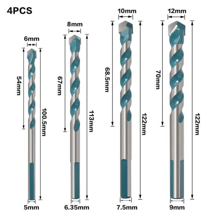Forets Qwork Lot Complet ZFYQ Foret Carrelage, Lot De 7 Forets Multi-matériaux Pour Carrelage Pointe Tungstène Durable ENCLUME,4 5 6 8 10 12 Forets triangulaires multi matériaux, 5 6 7 8 12 Tigrezy Lot de 5 Foret Carrelage Verre,Foret Gres Cerae,Foret Diaant... Emballage :Boîte en plastique transparent. Ces forets peuvent être utilisés pour le perçage du carrelage, du béton, de la brique, du verre, du plastique, du bois, etc. Caractéristiques : De haute qualité, durable, perçage précis dans différents matériaux en même temps, longue durée de vie. Caractéristiques : Contenu du lot :8 forets, 3, 4, 5, 6, 8, 10, 14, 16 mm Matériau :Pointes en carbure de tungstène., Tige :3 méplats., Couleur :Noir/argent. Mode d'emploi : Outil :Perceuse électrique. Perce le verre ou le carrelage mais également le matériau derrière. La pointe en carbure de tungstène résistant pénètre aisément dans différents matériaux (carrelage,béton, brique, verre, plastique et bois, etc) et réduit les risques de cassure. ENCLUME,7pcs--Jeu de forets en carbure de tungstène multi matériaux...
