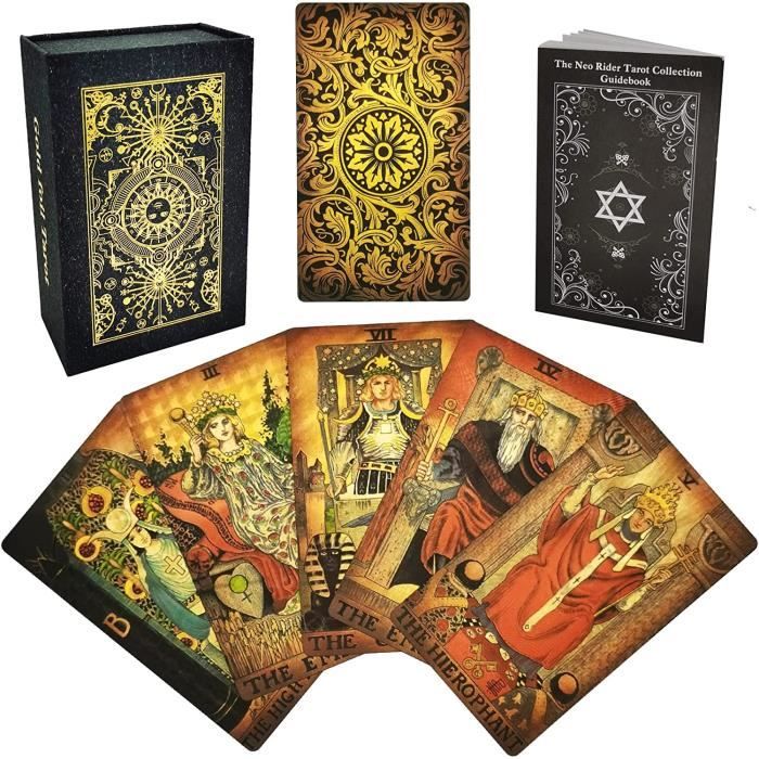 Ces jeux de cartes de tarot peuvent être utilisés longtemps sans être endommagés. Matériau PVC : Les cartes de tarot avec feuille d'or sont fabriquées en PVC, ce qui les rend imperméables. Elles n'ont pas tendance à se déformer et ne présentent pas de traces de pliage. Elles sont donc infroissables et durables. Or brillant : L'or est encore clairement visible sous le ciel nocturne. Jeu de tarot à lames d'or 78 2 pièces : Ce luxueux jeu de tarot se compose de 78 2 cartes de haute qualité avec des designs élaborés à feuilles d'or ainsi que d'un manuel illustré de 36 pages Vous pouvez ainsi acquérir une compréhension complète du symbolisme du tarot, des éléments et de leurs liens avec les signes du zodiaque et la numérologie Cela facilite la compréhension et l'assimilation des informations, ce qui vous permet de les maîtriser plus rapidement. Cartes dorées de haute qualité : les cartes ont une surface lisse, des couleurs vives, la taille standard, des bords nets et sont fabriquées en papier résistant. Tarot De Marseille PVC Lot De 78 Cartes De Tarot Avec Guide (français Non Garanti), En PVC Jeu De Tarot Pour Débutants 78 cartes de tarot originales en feuille d'or avec guide, cartes de tarot Waite uniques avec boîte cadeau noire, cartes de tarot en feuille d'or avec signification, cartes de tarot en boîte, cartes de tarot durables et imperméables résistantes aux plis, convenant aux débutants comme aux professionnels avancés, divination et prédiction... Elle contient non seulement des mots clés, mais aussi des interprétations détaillées pour les positions debout et inversées. Ils conviennent donc à tous les lecteurs qui recherchent des cartes de tarot haut de gamme exquises Les cartes sont extrêmement faciles à mélanger et possèdent une résistance suffisante aux pliures. Divertissement intéressant : l'utilisation du tarot pour la divination n'est pas seulement amusante, elle est également instructive. Découvrez la Signification des 78 Cartes du Tarot : Un Guide Bon design : chaque carte de ce jeu est un véritable trésor de connaissances. Avec ce jeu de tarot, vous n'avez pas besoin de perdre du temps à chercher des explications sur Internet ou à feuilleter le manuel. Chaque carte de tarot pour débutants est expliquée en détail dans le manuel d'utilisation. Jeu de tarot à lames d'or 78+2 pièces : Ce luxueux jeu de tarot se compose de 78+2 cartes de haute qualité avec des designs élaborés à feuilles d'or ainsi que d'un manuel illustré de 36 pages.