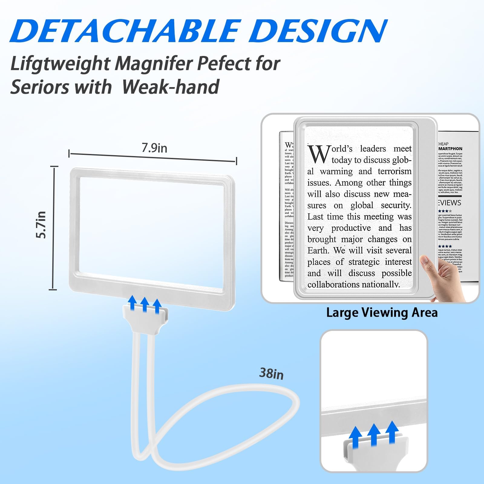 Observation à grande échelle Les grandes pages vous permettent une meilleure expérience de lecture sans distorsion et améliorent votre efficacité de lecture et votre travail. Loupe éclairante Sans Distorsion Loupe À Main Libre 5X, Col De Cygne Flexible À 360° Loupe De Lecture Loupe Main Libre Pour Lecture Cette loupe peut grossir les petits caractères jusqu'à 500 % sans distorsion optique Vous pouvez placer le téléphone à l'angle que vous souhaitez pour agrandir l'écran. Lentille transparente de qualité optique: Avec une zone de visualisation de la loupe de 9., 5x7., 5 inches (24x20 cm), vous pouvez visualiser une plus grande zone sans avoir à déplacer la loupe à plusieurs reprises. Efficace pour réduire la fatigue oculaire: Conception antireflet, idéale pour les personnes qui ont besoin de travailler de près en permanence ou pour compenser le vieillissement des yeux et la dégénérescence maculaire. Loupe 5X avec Support, loupe Pleine Page 8 "x5.7, col de Cygne Flexible Cette loupe éclairante possède des lentilles claires de qualité optique pour des images sans distorsion. Vous pouvez également régler facilement le niveau de luminosité à l'aide du variateur pour sélectionner la lumière idéale, même lorsque vous lisez la nuit, sans déranger les autres avec la lumière. Libère tes mains Cette loupe à porter autour du cou et à utiliser sans les mains est parfaite pour la lecture et soulage les yeux même dans les environnements faiblement éclairés grâce à 43 LED ultra lumineuses qui fournissent un éclairage plus uniforme et plus lumineux. Retirez-le et utilisez-le comme une loupe à main, conçue de manière ergonomique pour un contrôle facile. Aide à réduire la fatigue oculaire et à travailler toute la journée. Loupe à luminosité réglable] La loupe est équipée de 43 LED ultra-lumineuses intégrées qui éclairent la zone de manière plus homogène, réduisant ainsi la fatigue oculaire causée par une lumière inégale ou insuffisante, et sont plus économes en énergie que les LED conventionnelles. Vous pouvez également régler facilement le niveau de luminosité à l'aide du variateur pour... Loupe à Main Libre 5X avec Collier Lumineux,43 LEDs col de Cygne Flexible, loupe de Page 9.5x7.5pour Lire Les Petits caractères et Les Personnes malvoyantes aux Yeux vieillissants : : Fournitures de bureauDemandez le retour de ce produit jusqu'à 14 jours après sa réception, sans motif, pour en obtenir le remboursement complet (prix et frais de livraison) au titre du droit... 43 LED super lumineuses à économie d'énergie Lumière Luminosité réglable Grâce à son design ergonomique, la taille de la poignée convient à tout le monde et est confortable dans la main. main libre/manuel: Loupe de table amovible, vous pouvez attacher/déconnecter la loupe du support à tout moment. Description du produit Loupe mains libres pour la lecture de livres par les seniors