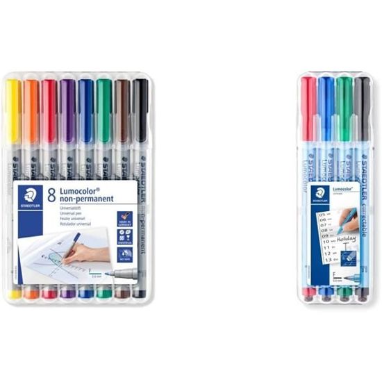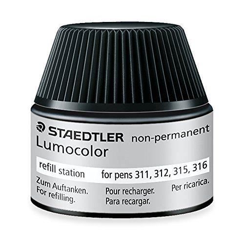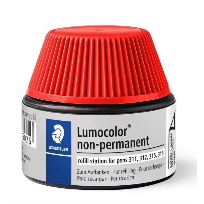 Lumocolor 316 Lot de 10 Feutres non Permanents Solubles dans l'eau Pointe F env. 0,6 mm Haute... Insérer simplement le marqueur dans le flacon Aucun risque de trop plein d'encre, le stylo ne peut absorber plus que sa propre capacité , Contenance 15 ml Encre Soluble à L'eau Lumocolor 312 - Etui Chevalet Staedtler Box 6 Feutres Non-Permanents Recharge Propre Pratique Flacons recharge en polypropylène pour une recharge propre et pratique des feutres et marqueurs Lumocolor Recharge pratique en polypropylène pour feutres Lumocolor non permanents. Insérez le feutre dans le flacon et en quelques minutes, il est prêt à l'emploi. Complètement rechargé en 3 à 4 heures, sans risque de débordement. Encre non permanente, soluble à l'eau et effaçable En quelques minutes le feutre est prêt à l'emploi et après 3 à 4 heures, il est complètement rechargé STAEDTLER Lumocolor non-permanent Nachfüllststaion 487 15 • blau • 5,19