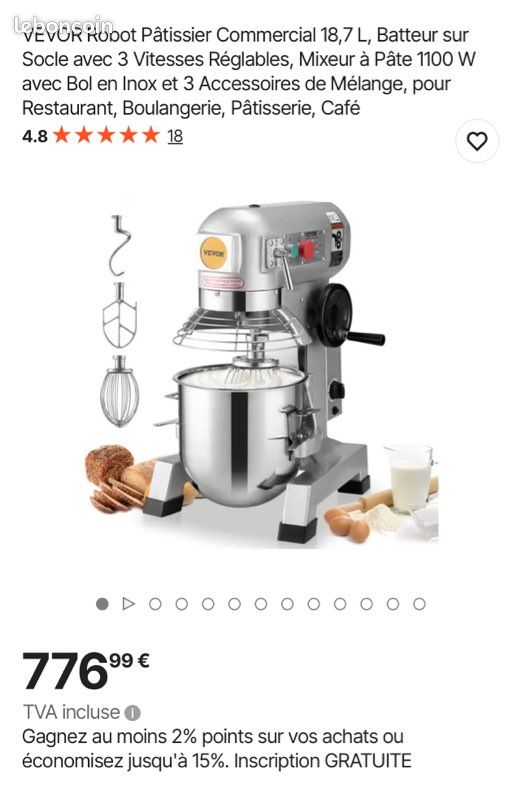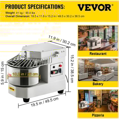 De plus, tous les composants qui entrent en contact avec les aliments, y compris le bol, les crochets et les tiges, sont en acier inoxydable de qualité alimentaire. Robot Patissier Multifonction 33 L Robot de Cuisine 1100 W Robot Le crochet pétrisseur est utilisé pour des opérations de mélange plus douces, idéales pour les pâtes lourdes comme la pâte à pizza. Batteur Smeg VEVOR Robot Pâtissier Commercial 18,7 L, Batteur Mélangeur Avec 3 Vitesses Reglables Mixeur A Pate 1100 W Avec Bol En Inox Et 3 Accessoires Melange 92886150 Bol Inox 3 Vitesses Réglables SpécificationsNuméro de modèle de l'article : B20BPuissance : 1100 WVitesse à vide : élevée 382 tr/min, moyenne 161 tr/min, faible 108 tr/minVitesses : 3 vitessesCapacité : 18,7 LCouleur : Argent étincelant + couleur métal naturelMatériaux principaux : Fonte HT200 / Q235 / SUS201 / SUS304Poids : 63 kg / 138,9 lbTaille du produit : 533 x 462 x 780 mm / 20,98 x 18,19 x 30,71 poucesContenu du Colis1 x robot pâtissier commercial1 x crochet pétrisseur1 x batteur plat1 x Fouet métallique Ces composants fiables sont résistants à la rouille, à la corrosion et faciles à nettoyer. Robot Patissier Commercial 28,5 l, Batteur sur Socle avec 3 Vitesses Reglables, Mixeur a Pate 1100 w avec Bol en Inox et 3 Accessoires de Melange,. Vendu par... Il est excellent pour mélanger la plupart des types d'aliments tels que les crèmes, les légumes, les garnitures et la pâte. Arrêtez toujours la machine avant de changer de vitesse. Mixeur professionnel VEVOR avec un bol de 18,7 L, idéal pour mélanger de grandes quantités d'aliments à la fois. Il est doté d'un moteur puissant avec 3... La faible vitesse de 108 tr/min convient au pétrissage de la pâte, la vitesse moyenne de 161 tr/min est utilisée pour mélanger les garnitures et la vitesse élevée de 382 tr/min est idéale pour fouetter la crème. Système de mélange efficace : avec un moteur puissant de 1100 W et un système de transmission à engrenages, il permet un mélange rapide et uniforme. Polyvalent : le batteur sur socle est livré avec 3 batteurs, dont un crochet pétrisseur, un batteur plat et un fouet métallique. Mixeur alimentaire commercialMixeur professionnel VEVOR avec un bol de 18,7 L, idéal pour mélanger de grandes quantités d'aliments à la fois. Le fouet métallique est largement utilisé pour aérer les mélanges légers comme la crème fouettée ou les blancs d'œufs.