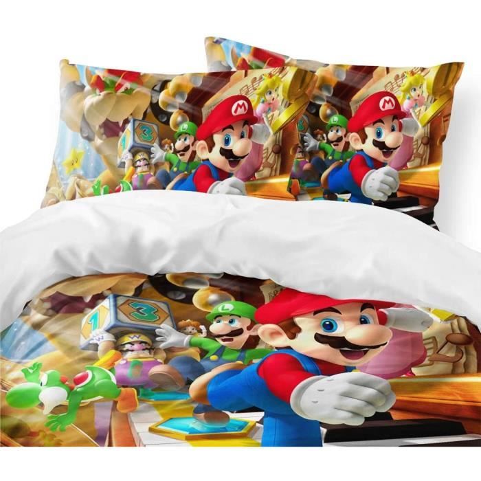 Textile en microfibre de polyester, doux et confortable, pour vous garantir un repos digne du Royaume Champignon. Parfaitement adaptée à un lit une place, un incontournable pour tous les fans du plombier moustachu. Dimensions Parfaites : Housse de couette 140x200 cm avec taie d'oreiller 63x63 cm, idéalement conçue pour un lit une place Une Taie d'oreiller élégante de 63 x 63 cm, agrémentée des emblématiques couleurs et illustrations de Super Mario Bros pour des rêves toujours plus riches. Super Mario Odyssey Parure de lit 2 pièces de Marque -1 Housse de Entretien facile résistant au lavage machine pour conserver ces couleurs éclatantes, soir après soir. Une Housse de couette mesurant 140 x 200 cm, illustrée de scène mettant en vedette Mario. Parure de lit enfant blanche Mario Kart housse de couette 1 taie d... Entretien Facile : Tissu résistant au lavage en machine, conservant ses couleurs vives et éclatantes lavage après lavage Mario et ses amis vous invitent au coeur de leurs aventures les plus épiques. Design Réversible : Parure de lit Super Mario Kart avec motifs colorés et dynamiques sur les deux faces, permettant de varier l'ambiance de la chambre Housse De Couette Enfant 140x200 Parure De Lit 90x190 Enfant MARIO BROS Parure Housse De Couette Parure De Lit 140x200 Enfant Garcon Rejoignez Mario pour une partie de Mario Kart complètement déjantée. Mario s'invite chez vous avec cette parure de lit 100% coton qui vous garantit une bonne nuit de sommeil. Elle ira à ravir dans la chambre de tous les fans de Mario Kart et apportera un peu de couleur. Produit sous licence officielle Super Mario et certifiée OEKO-TEX Qualité Premium : Textile en microfibre de polyester doux et confortable, certifié Label Oeko Tex garantissant l'absence de substances nocives