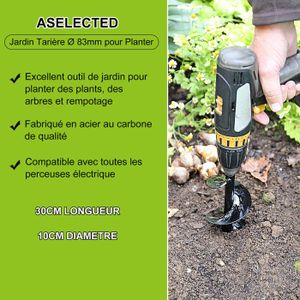 Que ce soit pour la plantation de nouvelles fleurs, la préparation de votre jardin pour les légumes, ou l'installation d'accessoires de jardin, notre produit est votre compagnon idéal. Mèche Jardin Tarière en acier Foret de tarière de jardin Foreuse Facile à attacher et à utiliser, il rend le jardinage rapide et agréable. Outil Jardin Creuser Trous FORET - MECHE Mèche De Tarière De Jardinage Pour Perceuse à Spirale Outil Plantation Trous Conçu pour les jardiniers soucieux de leur temps et de leur effort, ce foret vous permet de réaliser divers projets rapidement et efficacement. La qualité supérieure de l'acier allié assure une résistance à long terme contre l'usure quotidienne et les conditions météorologiques difficiles. Foret en spirale pour tarière de jardin, jardinière de fleurs de jardinage, perceuse de terre, outil de creusement de trous de plantation, accessoires de foret... Son design permet un nettoyage facile, assurant ainsi une longue durée de vie et une disponibilité immédiate pour votre prochain projet de jardinage. La peinture noire appliquée sur la surface assure une protection supplémentaire contre la rouille, prolongeant la durabilité de l'outil même sous des conditions climatiques difficiles. Grâce à la puissance des forets hélicoïdaux, vous pouvez creuser des trous en un temps record 30/22 cm de profondeur sur 8/4 cm de largeur. GAIN DE TEMPS, FACILE À UTILISER : Nos forets fonctionneront avec n'importe quel foret de 10 mm ou plus et de 18 V ou plus La spirale permet de creuser des trous précis et profonds en quelques secondes, idéal pour planter des bulbes, des fleurs ou des légumes, sans effort manuel intense. Il est également facile à nettoyer et à entretenir, ce qui en fait un outil fiable pour toutes vos activités de jardinage. Compatibilité et Utilisation Facile: Compatible avec la plupart des perceuses électriques disposant d'un mandrin de 10 mm ou plus, ce foret est recommandé pour une utilisation avec des perceuses de 18 V ou plus pour une performance optimale. Transformez votre perceuse en un puissant outil de jardinage avec notre Foret Hélicoïdal pour Jardinage. Entretien Simple et Efficace: Pour maintenir la performance optimale de votre foret hélicoïdal, nettoyez régulièrement la terre et les débris après chaque utilisation.