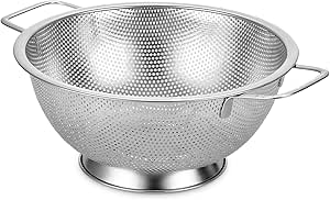 Cuiseur De Riz MGE - Passoire Cuisine Avec Poignée - Tamis Micro Perforée - Passoire Pour Riz, Spaghetti, Nouilles, Légumes - Acier Inoxydable - 22 Cm Passoire Grande Capacité MGE - Passoire Cuisine avec Poignées et Base - Tamis Micro Perforée Passoire de cuisine en acier inoxydable – Passoire à maille fine avec poignée | Tamis de cuisine pour tamiser, filtrer, égoutter et rincer les pâtes, riz... Sa surface lisse résiste aux taches et aux odeurs, facilitant ainsi le nettoyage L'eau s'écoule sans entrave, évitant ainsi tout colmatage dû aux débris alimentaires Doubles poignées anti-brûlures : Les doubles poignées de cette passoire Passoire à Pâtes En Inox sont solidement soudées pour une durabilité et une résistance accrues. Acier inoxydable : Fabriquée Passoire de Cuisine de haute qualité, sans BPA, cette passoire est résistante à la rouille, à la corrosion et durable. Leur conception ergonomique offre une prise en main confortable et sûre. Multifonction : Cette passoire Passoire de Cuisine est bien plus qu'une simple passoire à pâtes ; c'est un outil polyvalent pour votre cuisine. Elle égoutte les pâtes en quelques secondes, élimine rapidement l'excès de graisse des ingrédients, sert de bol de préparation pour un stockage temporaire et peut même servir de grille de cuisson vapeur ou d'égouttoir à légumes 3 x Tamis de Cuisine avec 2 Poignées en Acier Inoxydable, Passoire en...