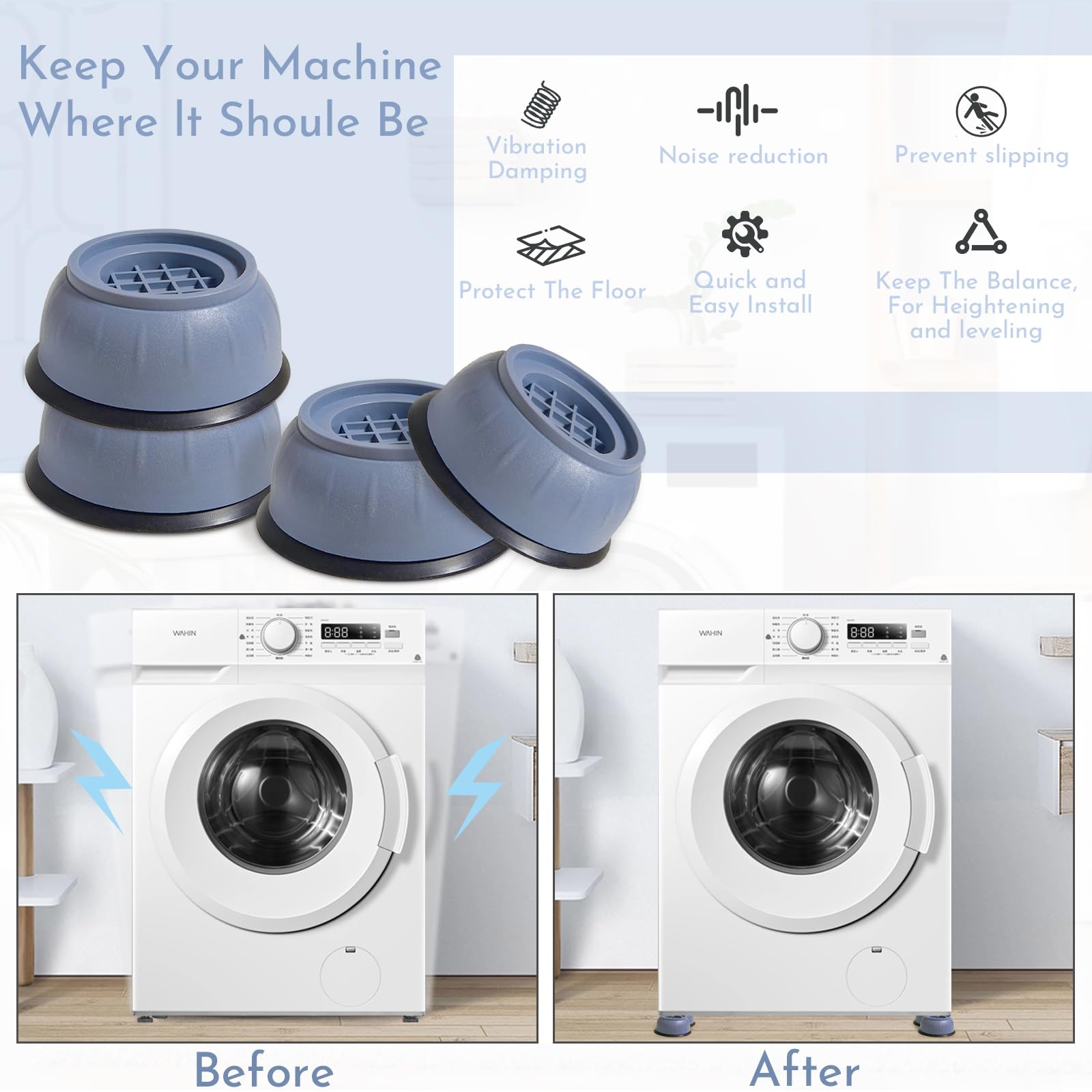 Niveleur Lave-linge Sol Irrégulier HURRISE Pieds Antidérapants Pour Machine à Laver - Réduction Du Bruit Support Antidérapant Sol Irrégulier Base antichoc Anti-Vibration pour pieds, tampons antidérapants Support de machine à laver universel avec roulettes réglables pour... - Également un niveleur pour équilibrer votre laveuse sur des escaliers ou un sol irrégulier, coussin antidérapant pour machine à laver. - des outils ou autres sont nécessaires, soulevez la machine et placez ces patins dans la bonne position, économisez du temps et des efforts avec les patins de pied réglables de la laveuse. Description des marchandises Coussinets anti-vibrations pour machine à laver Ce produit est un coussinet de pied de machine à laver, qui est fait de matière plastique durable, avec une bonne texture, sûr et pratique. Le forfait comprend 4 x pour machine à laver Caractéristiques -Matériau : Pieds de machine à laver en plastique anti-vibrations -Taille : 10,00 x 8,00 x 8,00 cm/3,93 x 3,14 x 3,14 pouces support de machine à laver -Couleur : stabilisateur de pied de machine à laver gris clair - Surélevez votre machine à laver, gardez votre laveuse sèche, plus facile à vidanger et à nettoyer les pieds stabilisateurs de la machine à laver. Pieds réglables Facile à installer et à utiliser, il peut être facilement appliqué à votre lave-linge, un accessoire très pratique qui répondra bien à vos besoins Plateforme de nivellement de à laver : surélevez votre à laver, gardez votre lave-linge , plus facile à vidanger et à nettoyer, patins de vibration de à laver Coussin de pied réglable pour ajuster les pieds : multifonctionnel, antidérapant, résistant aux chocs, couvre chaque coin de votre lave-linge ou sèche-linge, pieds anti-vibrations pour lave-linge et sèche-linge Amélioration de la hauteur : conçus pour s'adapter parfaitement sous les pieds de la machine, ces patins augmentent la hauteur de l'appareil pour un nettoyage plus facile et éviter l'accumulation d'humidité en dessous