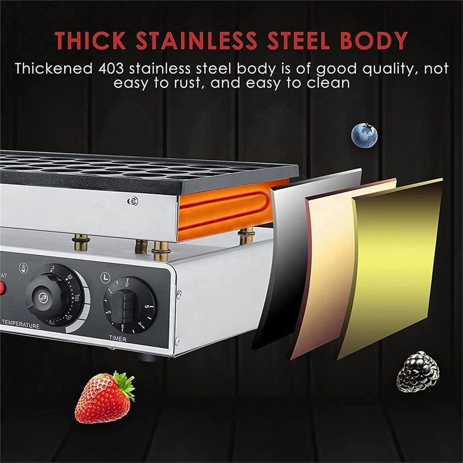 Puissance 1700W, plaques en acier inoxydable antiadhésives - la cuisson est uniforme et le nettoyage super facile. Double contrôle de température (50-300°C... Pieds stables: quatre pieds antidérapants sur le fond améliorent la stabilité pendant l'utilisation et empêchent le glissement ou le basculement. Plage de température : 50-300 °C. Vous pouvez les servir avec du sucre en poudre, du miel, de la sauce au chocolat, du beurre ou d'autres garnitures, laisser libre cours à votre créativité culinaire et vous offrir une expérience de petit-déjeuner unique. Taille de la zone de travail (L x l) : 49,5 x 26 cm. Détails : Long cordon d'alimentation : le cordon d'alimentation de 1,2 m vous permet de plus d'utilisations. Réglable et intelligent : avec les boutons rotatifs indépendants, vous pouvez programmer le produit en 1 à 5 minutes ou régler librement la température dans la plage de 122 à 572 ℉ pour répondre à différents besoins de production et rendre l'utilisation plus pratique et plus intelligente. Gaufrier commercial : cuisson rapide et uniforme Dimensions du produit : 54 x 29 x 16,5 cm. Utilisation : Ce produit est adapté pour les magasins de restauration rapide, les cafés, les boulangeries, les petites usines alimentaires, les magasins de boissons, les snackbars, les restaurants, les stands de rue, les écoles et d'autres endroits. Acier Inoxydable Qualité Alimentaire Machine à Muffins 50 Trous, Mini Machine à Gaufres Commerciale, Temps Et Température Réglables, Avec Fouet Et 2 Brosses, Revêtement Anti-adhésif, Pour Cuisine Et Restaurant Cuisson Muffins Réglable 2 pinceaux : vous pouvez appliquer l'huile uniformément et garder le goût des desserts constant. Il convient non seulement à un usage commercial, mais aussi à un usage privé. Distance pratique: la distance entre la plaque chauffante et le panneau de commande assure une bonne dissipation de la chaleur et un fonctionnement stable. Types d'EVA mousse haute performance : Guide complet sur la densité, le... Contenu de l'emballage : 1 appareil de cuisson pour muffins., 1 fouet., 4 chiffons de nettoyage., 2 brosses. Technologie de traitement du moule : revêtement antiadhésif Type de prise : norme européenne Source d'alimentation : filaire Méthode de chauffage : tube de chauffage Type de montage : plan de travail Assemblage requis : non., Nombre de trous : 50., Tension : 220 V., Fréquence : 50 Hz. Grâce à l'indicateur de chauffage, vous pouvez facilement observer l'état de fonctionnement et effectuer des ajustements à temps. 1 manuel d'utilisation en anglais. Matériau : acier inoxydable de qualité alimentaire. Conception réfléchie : l'interrupteur indépendant à un bouton rend l'utilisation facile et flexible.