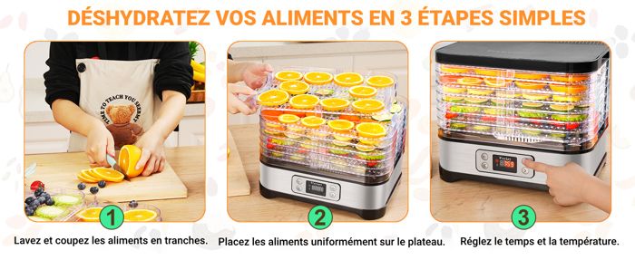 3 Pièces Séchoir À Fruits Séchoir À Aliments Galettes Végétariennes Découvrez notre comparatif détaillé des déshydrateurs alimentaires avec analyses des options et prix pour choisir facilement l'appareil qui répond à vos besoins culinaires Séchoir Fruits Légumes 8 étages 400W Minuterie Déshydrateur Alimentaire Machine Séchoir Alimentaire Déshydrateur Pour Déshydrateur Minuterie 72 Heures 42-70°C Taille du produit: taille de rangement: 31., 5 * 25 * 29cm Taille dépliée: 31., 5 * 25 * 36., 5cm Matériel: base en acier inoxydable Nombre d'étages: 8 Capacité: 16l Puissance nominale: 400W Tension nominale: 100 - 240V Vitesse de température: 3 vitesses (entre 42°c et 70°c / 105 - 158°f) Timing: 1H - 72H heures Mode d'emploi: plage de température constante: la température de séchage peut être réglée entre 105 - 158 ° f / 42 ° C à 70 ° C, la durée est de: 1 heure à 72 heures, le ventilateur continue à refroidir pendant une minute après l'arrêt Mode d'alimentation: plug - in Longueur du cordon d'alimentation: 1,5 m Poids avec emballage: 3200g Taille d'emballage: 35., 5 * 24., 9 * 32., 1 Liste de livraison: machine à fruits secs * 1 Température contrôlée de 42°c à 70°c pour une déshydratation précise et adaptée à différents aliments, vous pouvez personnaliser la dureté douce et préserver les nutriments. Déshydrateur Alimentaire, Séchoir Alimentaire Pour Légumes, Herbes Et... 【Panneau de commande numérique led】 minuterie réglable de 1 à 72 heures, arrêt automatique à la fin du programme. La construction sans bisphénol A garantit la sécurité et l'hygiène, ainsi que des caractéristiques de sécurité supplémentaires telles que la protection contre la surchauffe et l'arrêt automatique, vous donnant la tranquillité d'esprit et la tranquillité d'esprit pendant le fonctionnement. 【Design polyvalent et pratique】 polyvalent et pratique, le déshydrateur de nourriture est idéal pour préparer une variété de collations maison, y compris des chips de pommes, des croustilles, du boeuf séché, des herbes et des aliments pour animaux de compagnie. 【Circulation d'air】 le séchoir à aliments est entraîné par un ventilateur et un élément chauffant installés en bas, la circulation d'Air assure un séchage uniforme des aliments.