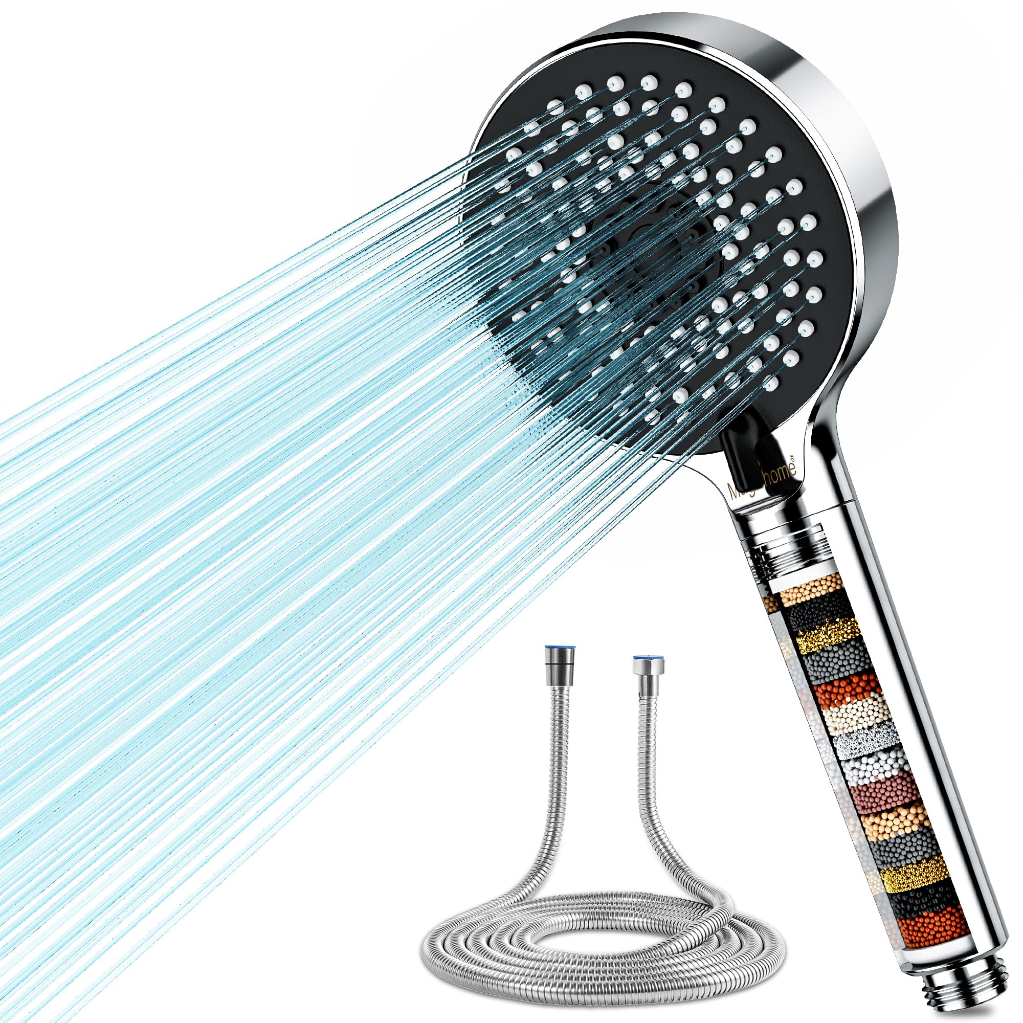 Magichome Pomme de douche filtrante et tuyau 2 m, 6 modes, haute pression, adoucisseur d'eau dure, pommeau de douche avec accessoires supplémentaires remplaçables Pommeau douche, magichome pommeau douche anti calcaire économiseur d... Douchette économie D'eau Tuyau 1,5m Magichome Pommeau De Douche Filtrante Et Tuyau De 1,5 M, 20 étapes, Avec 5 Modes, Pommeau De Douche Universel à Filtre à Eau Dure Pour éliminer Le Pommeau De Douche Haute Pression Cela contribue à restaurer la santé de la peau ainsi qu'à des cheveux plus lisses et plus doux. Utilisation à une main - Changement de mode sans effort : grâce au mécanisme de roulement à pression, le pommeau de douche permet un changement de mode sensible (300 % plus sensible que les modèles standard) qui fonctionne avec précision même avec des mains très moussées Si vous vivez dans une zone d'eau dure et que vous avez besoin de remplacer le pommeau de douche, le pommeau de douche ionique à surpression nouvellement amélioré de est un meilleur choix.[Triple Filtre] - Pommeau de douche ionique utilise 3 pierres minérales différentes pour éliminer le chlore et le fluorure, les métaux lourds, les... Il est recommandé de remplacer le filtre de douche tous les trois à quatre mois Utilisation continue d'une seule main pour un changement de mode sans problème. Haute pression et économie d'eau : ce pommeau de douche adopte une structure interne unique et une technologie d'impression ainsi qu'une distribution régulière de la buse en silicone, ce qui assure un débit d'eau plus fort et une pression d'eau stable, tout en économisant de l'eau. Idéal pour différentes utilisations telles que le lavage quotidien des cheveux, la douche douce, le massage, le bain des enfants ou des animaux domestiques, ainsi que le nettoyage de la salle de bain
