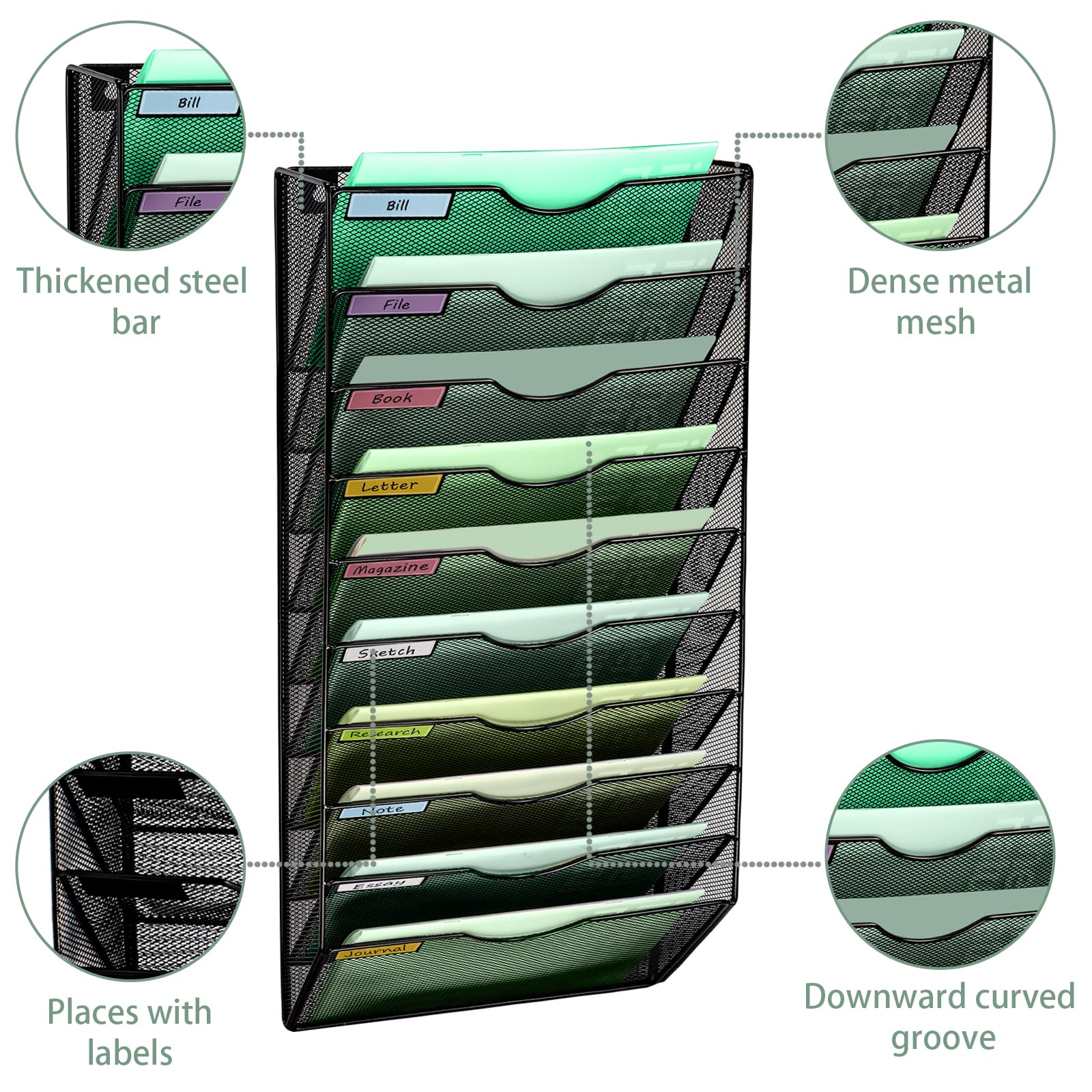 Organisateur tiroir,classeur mural à 10 poches, porte-fichiers et... Ce porte-revues mural tire pleinement parti de votre espace vertical Contenu de l'emballage : le porte-documents mural est livré avec des vis de montage qui peuvent être facilement montés sur le mur Gain De Place Vertical Organisateur Bureau Maille Organiseur Mural 5 Niveaux Maille - Porte-documents Vertical - Gain De Place Bureau Porte-documents Mural Organiseur De Bureau Tendance et populaire : design élégant et contemporain en maille qui peut décorer votre mur et garder votre bureau ou votre maison propre et bien rangé. Ce porte-documents suspendu en filet comporte 12 niveaux, permettant un accès facile et un tri des documents, et comprend un plateau plat au bas pour un rangement supplémentaire. Sa fabrication en maille noire durable est à la fois légère et robuste, ajoutant une touche moderne à tout environnement de bureau, de maison ou d'école Porte-documents mural durable : cette poche murale en maille A4 est fabriquée en matériaux métalliques de haute qualité, et cet organiseur de courrier et magazines a une construction en métal solide et une finition durable avec revêtement en poudre Organisateur mural 12 emplacements