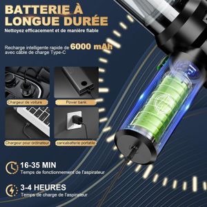 Aspirateur à main - Sans fil et rechargeable - 10000PA - Efficace et puissant - Pour La batterie 5000mAh se recharge en 2-3h via USB-C et tient 16-20min. Livré avec plein d'accessoires : brosses, buses, et 2 filtres HEPA lavables. Parfait pour... Batterie 6000mAh Type-C Aspirateur à Main Sans Fil Rechargeable Aspirateur Portable Puissant Mini Aspirateur Voiture Maison Avec 3 niveaux d’aspiration, il élimine facilement poussières, miettes et poils d’animaux sur les canapés, claviers ou dans la voiture. 【Batterie 6000 mAh et Charge Rapide via TYPE-C】Doté d’une batterie puissante de 6000 mAh, cet aspirateur portable offre une autonomie de 12 à 30 minutes – plus le niveau de puissance est élevé, plus la batterie se décharge rapidement. ConBlo Aspirateur à ain sans Fil, 10000PA Puissant Aspirateur à ain... 【4-en-1 : Aspiration, Soufflage, Gonflage, Aspiration Sous Vide】Ce mini aspirateur intègre 4 fonctions en un seul appareil : aspirer, souffler, gonfler et aspirer sous vide. Le grand réservoir collecte plus de saleté, tandis que les buses courtes et longues permettent un nettoyage en profondeur ou en surface. 【Pliable, Léger et Toujours à Portée de Main】Compact et sans fil, cet aspirateur pliable est idéal à la maison comme en déplacement. Comprend deux filtres (un métallique et un en tissu) pour maintenir une forte puissance d’aspiration et prolonger la durée de vie de l’appareil.