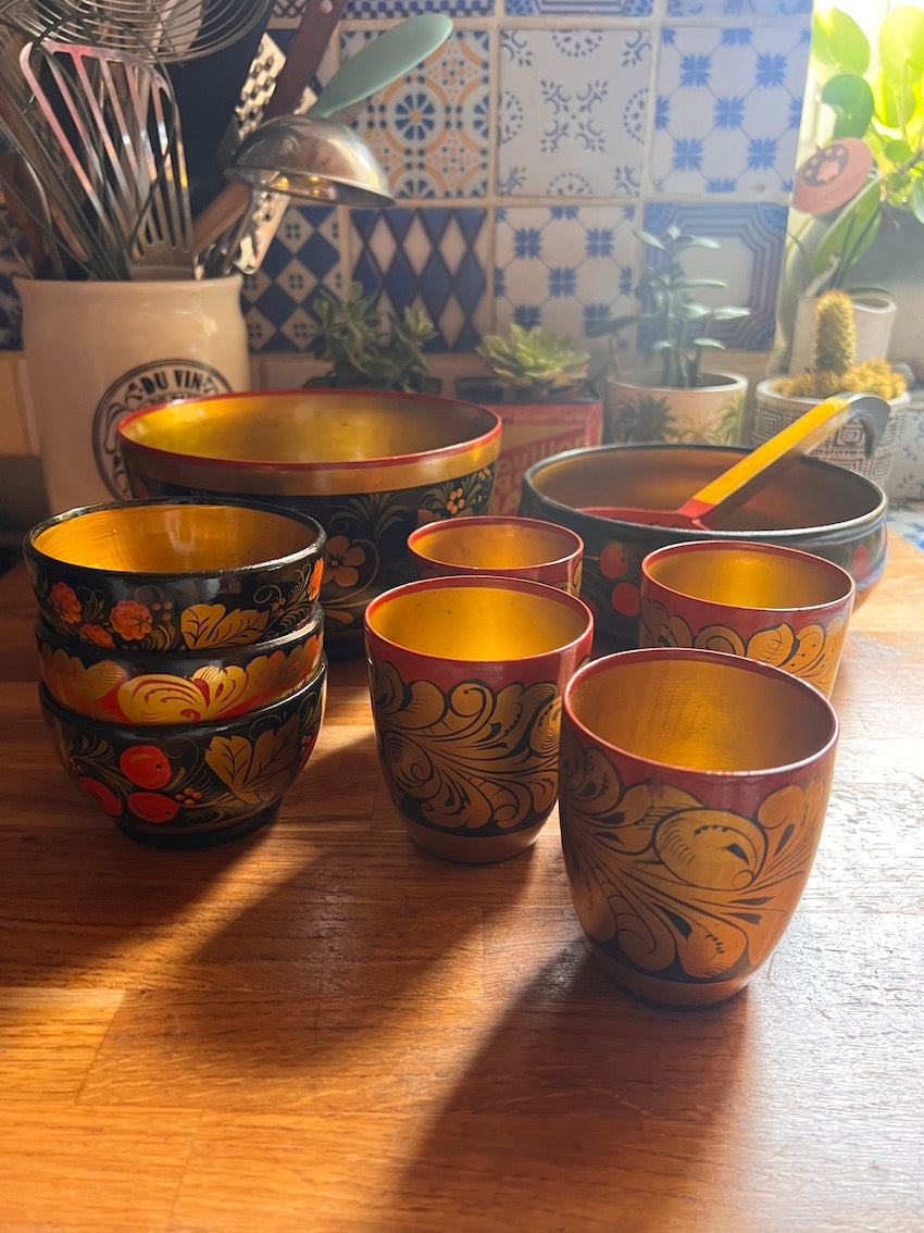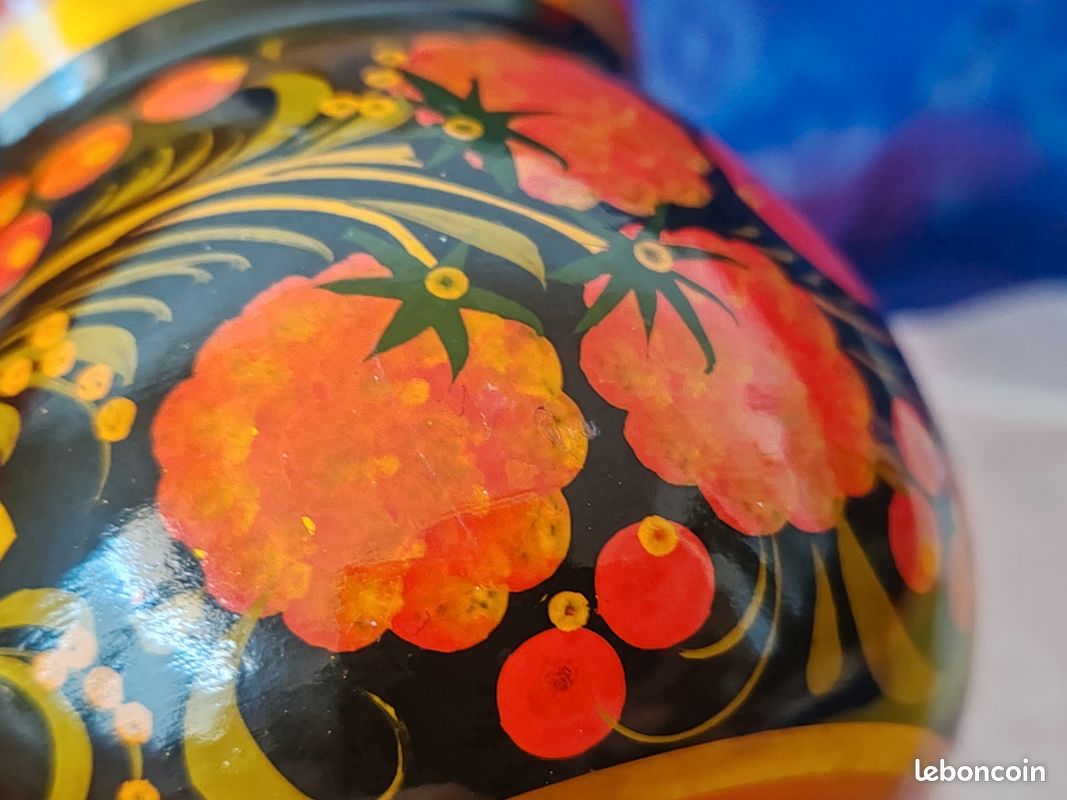Cette salière Khokhloma fabriquée à la main ajoute une touche de tradition russe authentique à votre décoration de cuisine, ce qui en fait un accessoire parfait pour servir et un sujet de conversation unique. Cadeau Artisanal Motifs Colorés Cullère Pente à La Man En Bos Vntage, Art Populare De Collecton Salière Bois Peint Main Russe Mesurant 7,6 cm de haut, cette pièce exquise est méticuleusement peinte à la main, mettant en valeur les motifs vibrants et symboliques de Khokhloma, l'une des traditions artistiques les plus anciennes et les plus chères de Russie. Boite en bois Khokhloma - Cadeau original plaisant qui sera toujours à portée de vos yeux Parfaite pour une utilisation fonctionnelle et décorative, cette salière Khokhloma ajoute une touche de charme russe traditionnel à n'importe quelle table de salle à manger ou décoration de cuisine. C'est un excellent ajout à toute collection d'art populaire ou un cadeau attentionné pour ceux qui apprécient la beauté artisanale Embrassez l'héritage et l'art de Khokhloma avec cette belle salière, une pièce aussi pratique qu'enchanteresse. VINTAGE KHOKHLOMA/HOHLOMA RUSSE soviétique URSS Art en bois peint à la... Ces motifs sont appliqués à main levée par des artisans qualifiés, assurant qu'il n'y a pas deux pièces identiques. La palette de couleurs chaudes, inspirée de l'iconographie, symbolise la beauté, la prospérité et la pureté spirituelle. Découvrez la beauté de l'art populaire russe avec cette salière Khokhloma de 7,6 cm, peinte à la main avec des motifs traditionnels et des couleurs vives, ce qui rend chaque pièce unique et parfaite pour n'importe quelle table. Lot de vaisselle en bois vintage peinte à la main Tradition Chaque salière Khokhloma est un chef-d'œuvre unique, orné de motifs complexes de baies de sorbier, de fraises, de fleurs, de feuilles, d'oiseaux, de poissons et d'animaux. Fabriquée à partir de bois de haute qualité, cette salière Khokhloma dispose de motifs complexes peints à la main de baies, de fleurs et de feuilles, symbolisant la prospérité et la pureté spirituelle.