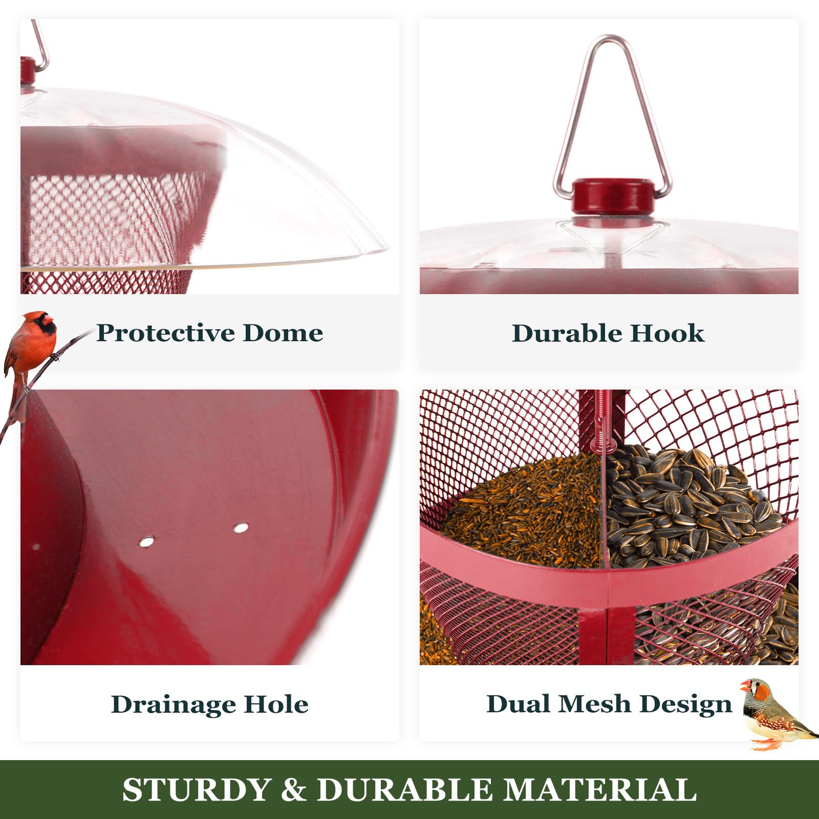 Kingsyard Mangeoires à oiseaux sauvages en maille métallique pour suspension extérieure, mangeoire à oiseaux pour pinsons tubulaires pour arrière-cour et jardin, capacité de 0,9 kg de graines de Kingsyard Mangeoires d'oiseaux pour l'extérieur, mangeoire à oiseaux... Mangeoire Oiseau Mangeoires Pour Oiseaux Sauvages Kingsyard Mangeoires à Oiseaux En Métal Pour Suspension Extérieure, Tube Extra épais Avec Cintre En Acier x Exterieur Mangeoire Métal Attirer Pinsons Cardinaux Kingsyard Mangeoire à oiseaux extérieure, mangeoire à oiseaux en maille métallique à double dôme résistante aux intempéries, capacité de graines pour pinsons cardinaux, 2,5 lb Compartiments fonctionnels : remplissez votre mangeoire avec différents types de graines, pour attirer une variété d'oiseaux encore plus large. Kingsyard Mangeoire à oiseaux en métal pour l'extérieur Kingsyard et... Fabriqué avec des matériaux durables et des trous de drainage intégrés pour supporter des aliments plus durables. Le compartiment principal peut contenir jusqu'à 1,1 kg de graines Si vous n'êtes pas entièrement satisfait, il vous suffit de contacter notre service client amical pour un remboursement complet ou un remplacement. Facile à remplir et à nettoyer : soulevez simplement le couvercle supérieur ou la base pour un remplissage sans effort.