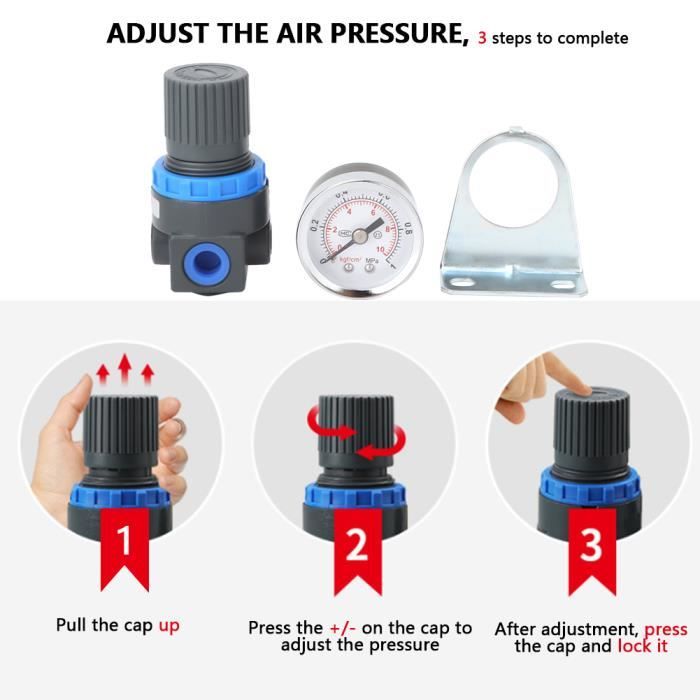 Modifiez facilement les paramètres à la volée, gagnez du temps et améliorez l'efficacité de vos tâches de compression d'air. [Contrôle précis de la pression] : cette vanne de régulation du compresseur de manomètre de contrôle d'air AR2000 assure un réglage précis de la pression, vous permettant de gérer la pression de l'air avec facilité et précision. Régulateur Air Bouton Verrouillage Rapide Manomètre De Compresseur D'air - EJ.LIFE - Noir - Cadran Facile à Lire Vanne Installation Facile Système Pneumatique Robuste et fiable : fabriquée en alliage d'aluminium, cette valve de régulation est conçue pour gérer les situations de haute pression tout en conservant son... Affinez vos paramètres pour répondre à des besoins spécifiques sans effort, ce qui le rend parfait pour diverses applications. Caractéristiques : * Contrôle précis de la pression : la valve de régulation assure un réglage précis de la pression, vous permettant de gérer la pression de l'air avec facilité et précision. Matériau : alliage d'aluminium. Sa conception commune assure la compatibilité avec diverses configurations de compresseurs, ce qui en fait un choix polyvalent pour différents besoins industriels et commerciaux. Construction durable en alliage d'aluminium : fabriquée avec une coque en alliage d'aluminium robuste, cette valve de régulation offre une résistance exceptionnelle à la haute pression. * Installation facile : la valve de régulation est conçue pour une installation sans effort, ce qui vous permet d'économiser du temps et des efforts. Intégrez-le facilement dans votre système de compresseur existant sans tracas. Caractéristiques : * Nom de la pièce : manomètre de contrôle de l'air - Valve de régulation du compresseur. Réglage rapide et pratique] : dotée d'un bouton de verrouillage convivial, cette valve permet un réglage rapide et simple de la pression. Modifiez facilement les paramètres à la volée, gagnez du temps et améliorez l'efficacité de vos tâches de compression d'air. AR2000 Vanne de régulation de pression d'air avec manomètre... Conçu pour résister à des conditions difficiles sans se casser facilement, il promet des performances durables dans des environnements exigeants. Compatibilité polyvalente : avec un diamètre de bouche G1/4, cette valve de régulation s'adapte à une large gamme d'applications. *Polyvalent et compatible : avec un diamètre de bouche G1/4, cette valve de régulation est adaptée à une large gamme d'applications et peut être facilement intégrée dans divers compresseurs. Manomètre de pression d'air Impact Controller 2 ANEST IWATA pour pro