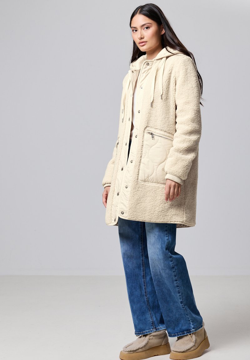 Manteau long gris avec un col haut, présentant des accents en tricot texturé au niveau. Tissu en feutre gris avec une texture lisse, doté d'une fermeture éclair... Les poches latérales avec fermeture éclair et une boutonnière sur toute la longueur en font le compagnon idéal pour la mi-saison., Manteau pour femme Poches latérales zippées Street One Femme Manteau Double Face Doux Pour Femmes En Vert Manteau Habillé Chic Femme Les éléments en tricot sur le col montant apportent une touche élégante, tandis que l'aspect laine assure un aspect de qualité supérieure. Le manteau avec détails en tricot de Street One pour femmes convainc par son col montant et sa patte de boutonnage cachée. Des poches latérales avec fermeture éclair et un matériau chaud en font le compagnon idéal pour l'hiver Le manteau Street One pour femme combine élégance classique avec des détails modernes. Manteau avec motif pied-de-poule pour femmes en Bleu|Beige