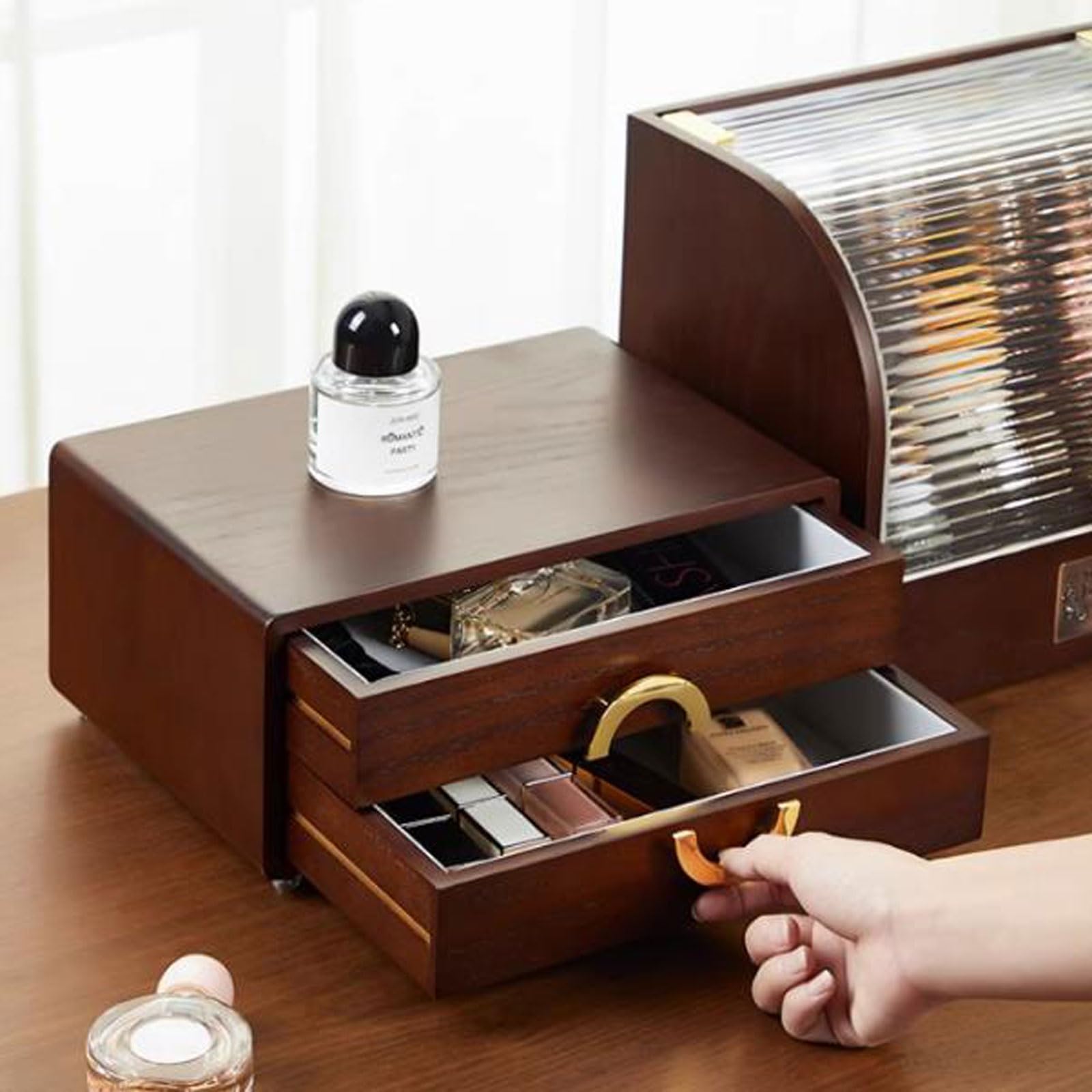 【Organisation gain de place】 La conception verticale permet d'économiser considérablement l'espace sur le plan de travail tout en organisant de manière claire les cosmétiques, produits de soin et accessoires. 【Design élégant et robuste】 Cet organisateur de maquillage, fabriqué en métal laqué et plastique haute qualité, allie élégance et durabilité. 【Assemblage rapide sans outils】 Montage par emboîtement simple sans aucun outil - l'organisateur est prêt en une minute. La structure ouverte et la palette de couleurs claires offrent une excellente visibilité des objets, alliant praticité et expression haut de gamme. Organisateur cosmétique rotatif 3 niveaux avec 4 tiroirs anti-poussière Garde la salle de bain et la coiffeuse toujours bien rangées, créant u ambiance propre et agréable. La conception modulable amovible permet d'utiliser chaque étage individuellement ou de les combiner librement. Description du produit 1. Organisateur de maquillage : notre boîte de rangement pour cosmétiques vous permet d'accéder facilement à tous vos rouges à lèvres, brillants à lèvres, pinceaux, parfums, vernis à ongles, crèmes pour les yeux, et plus encore, permettant une sélection rapide de vos articles souhaités et vous faisant gagner du temps et des efforts. 2. Gardez-le bien rangé... Faites plaisir à votre famille, vos amis ou à vous-même avec cet organisateur pour salle de bain, chambre ou commode. 【Design moderne et épuré】 De style nordique légèrement luxueux, avec des textures verticales lisses et des supports en acier, les couleurs fraîches mettent en valeur une esthétique contemporaine. 【Optimisation de l'espace sur 3 niveaux】 Avec ses trois étages, cet organisateur cosmétique offre un ample espace de rangement pour produits de maquillage, outils beauté et bijoux. Organisateur Plastique Métal Or Organisateur Maquillage, Rangement Maquillage, Présentoir Cosmétique, Ambre, 3 Couches Organisateur De Rangement Make Up Utilisation Flexible]Avec des poignées pratiques, des supports et un design en U pour un accès facile, cet organisateur de coiffeuse est idéal pour les crèmes, parfums, rouges à lèvres, bijoux et plus encore 【Idée cadeau idéale pour femmes】 Un cadeau à la fois stylé et pratique pour anniversaires, fêtes ou occasions spéciales.