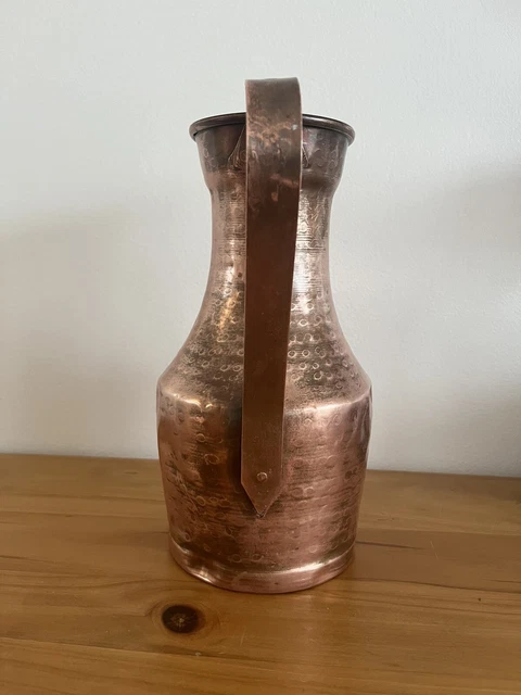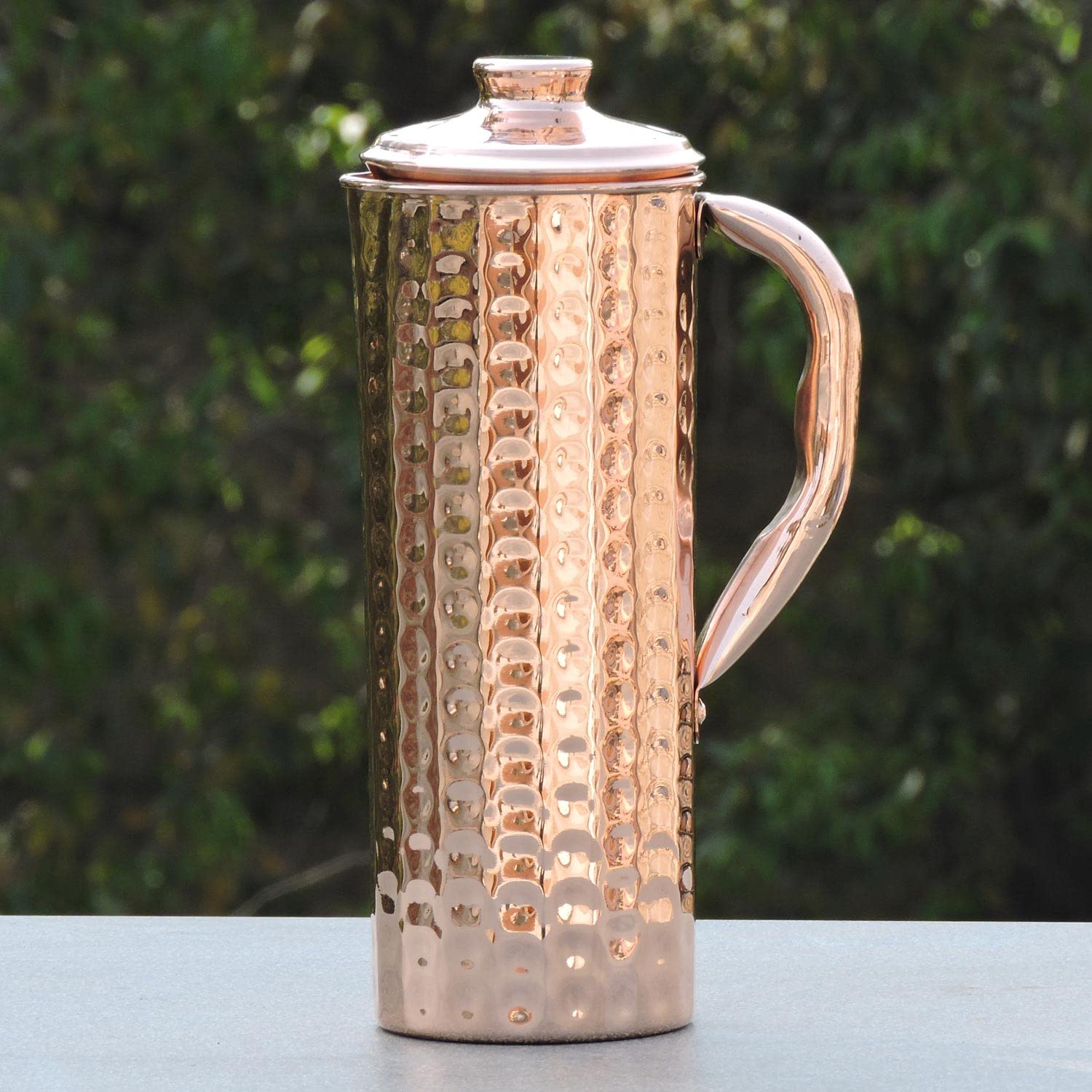 Stylish Hammered Copper Jug With a Vintage Look Ideal for Serving Water Beverage Ustensile Cuivre Service Boissons Pichet 1.6L Martelé Pichet Ayurvédique En Cuivre 1,6L - Surface Martelée Diamant - Purification Eau Naturelle - Artisanal Verre En Cuivre Pur Water Bottle With Copper Inside Description du produit La cruche en cuivre dégage un certain flair ancien et bien voyagé. Remplissez votre carafe et laissez-la toute la nuit pour permettre au cuivre de purifier doucement et naturellement votre eau et de charger positivement votre eau avec un oligo-élément de cuivre. La cruche en cuivre sera sans aucun doute un sujet de conversation dans votre maison. Ce métal flexible... Caractéristiques : matériau : cuivre, couleur : marron, volume : 1,6 l, hauteur : 21,6 cm, largeur : 12 cm, poids : 420 g IndianArtVilla Pichet en cuivre artelé otif Royal Surai 1600 l... Grande capacité de 1,6 l : idéale pour servir de l'eau ou d'autres boissons, cette carafe de taille généreuse est parfaite pour un usage quotidien, que ce soit à la maison, au bureau ou pour des réunions spéciales. Design martelé traditionnel : doté d'une texture martelée magnifiquement fabriquée à la main, ce pichet offre une touche unique et artisanale, parfait pour améliorer votre décoration d'intérieur et vos besoins de service.