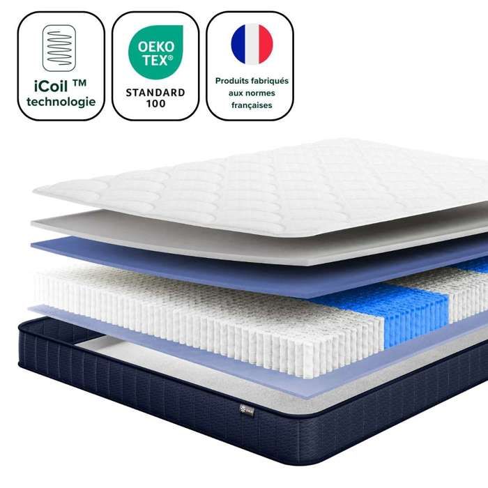 Le bruit est minimal lors du changement de position, ce qui le rend idéal pour les dormeurs légers ou les couples. Excellent soutien : la structure interne du TXO matelas 140 x 190 se compose de 10 couches qui offrent un excellent soutien. Tissu antistatique : ce matelas est fabriqué à partir d'un matériau antistatique unique qui vous protège de l'électricité statique par temps sec. Design à ressorts encastrés, profitez d’un sommeil indisturbé Chaque ressort est individuellement enveloppé dans une poche, éliminant les bruits de résonance lors des mouvements. Matelas ressorts ensachés 140x190 cm NIGHTITUDE CHAMPION Garantit un sommeil sans interruption toute la nuit. Dotés d'une élasticité durable, ils assurent un soutien stable, favorisant ainsi un sommeil profond. RELAX Matelas à ressorts ensachés et viscoélastiques MIA hauteur 29 cm Confort Maximum - 160x190... Sécurité et santé : les matériaux utilisés dans le matelas à ressorts 140x190 sont certifiés Oeko-Tex et CertiPUR-US. Ils s'adaptent aussi bien à la position allongée qu'à la position latérale, épousant les courbes du corps. Si vous avez des enfants, vous n'avez pas à vous soucier de les réveiller. Certifié Oeko-Tex Sans Produits Toxiques Matelas 80x200 à Ressorts Ensachés - Mémoire De Forme - à 9 Zones Avec Revetement Amovible Haut 25 Cm Parigi 14819074 Soutien 7 Zones Dos Matelas Epeda Reset ferme avec ressorts ensachés La surface du matelas est composée d'un tissu respirant, confortable et doux, qui vous enveloppe et soulage votre fatigue après une dure journée de travail.