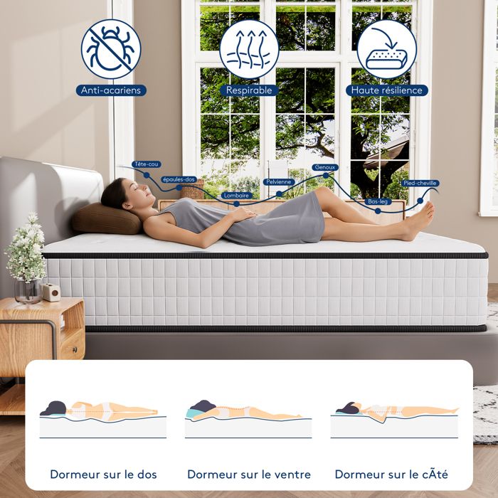 DEWINNER : Matelas a Memoire de Forme en Mousse et Ressorts Elle réduit efficacement le bruit et les vibrations générés par le retournement, atténue les interférences du sommeil et contribue à une meilleure expérience de sommeil. Matelas Ressorts Ensachés Mémoire Forme DEWINNER Matelas Ressorts 140x190 Cm, Confort, 7 Zones Ergonomique,25 Matelas Hybride Noyau à ressorts ensachés indépendants : Combinant mousse à mémoire de forme haute densité et ressorts ensachés indépendants, il offre un équilibre parfait entre souplesse et fermeté. Soutien parfait à 7 zones : Le noyau à ressorts ensachés à 7 zones offre un soutien précis et inégalé, quelle que soit la morphologie. Il s'adapte automatiquement à différents styles de sommeil, répartit uniformément la pression et assure un sommeil réparateur Matelas UPSILON 140x190 cm-24 cm-Mousse à mémoire de forme HR 35 kg-7... Tous les tissus sont certifiés OEKO-TEX, garantissant l'absence de substances nocives, un choix sûr. Tissu de haute qualité : Choisissez des tissus tricotés de haute qualité, doux pour la peau. Large gamme d'utilisations : Trois tailles sont disponibles pour s'adapter à différents types de lits, un matelas pour de multiples usages. Elle est respirante, douce et fraîche. Leur texture délicate est douce pour la peau, sans risque d'allergies ni d'irritations, et vous permet de dormir plus sainement. Structure double couche avancée : La surface unique en tricot du matelas Cloud favorise une circulation d'air continue, favorise la dissipation de la chaleur et de l'humidité et favorise le sommeil.