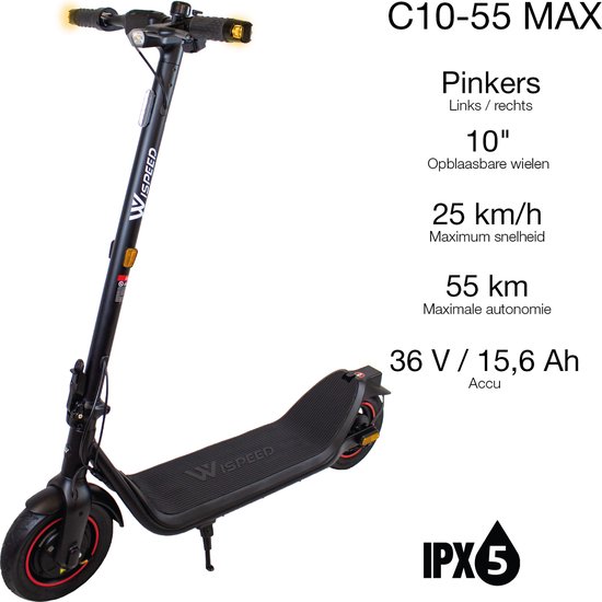 Temps de charge complet : 5,5h. SÉCURITÉ : Grâce à ses 2 clignotants avant et ses 6 réflecteurs, la C10-55 MAX vous permet de bénéficier d’une grande visibilité pour votre sécurité. Code de vérrouillage personnalisable. Les caractéristiques : Marque : Wispeed Poids : 17,9Kg Autonomie : jusqu’à 35 km Vitesse maximale : 25 km/h Nombre de roues : 2 Taille de roues : 10’’ Trottinette électrique Trotinette Électrique Wispeed C10-55 Max Optimisation du confort grâce aux larges poignées et amortissement des chocs avec ses chambres à air. A 25 km/h, avec 35 km d’autonomie et un moteur de 350 W, vous allez redécouvrir votre ville. Trottinette routière - Puissance moteur nom/max : 350/650W · Batterie 36V 15,6AH - Autonomie 55 km · Temps de charge 8H - Etanchéité IPX5 · Les du produit... Si toutefois vous n'êtes pas satisfait de notre produit, n'hésitez pas à contacter notre Service Après Vente, nous trouverons avec vous une solution adaptée pour remédier à la situation Très maniable, la C10-55 MAX offre un confort de route optimal grâce à son frein à disque avant et arrière, son deck ultra plat et ses phares LED avant et arrière. Équipée de LED d'un écran LED avec indications des informations de conduite. Trottinette électrique Wispeed 350W Autonomie 55km Wispeed - C10-55 Max - Trotinette Électrique Pour Adultes Trottinette Pliable Freins Disque LED EN STOCK : Trotinette électrique WISPEED C10-55 MAX pas cher - Retrait & Livraison - Paiement 4X disponible. Loisirs extérieurs à prix discount OPTIONS DE VITESSE : La Wispeed dispose de 4 modes de vitesse : Piétons (6km/h), Eco (15km/h, Intermédiaire (20km/h) et Maximum (25km/h), s'adaptant à vos différents trajets.