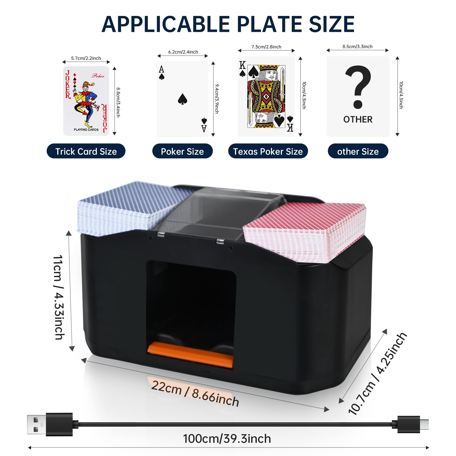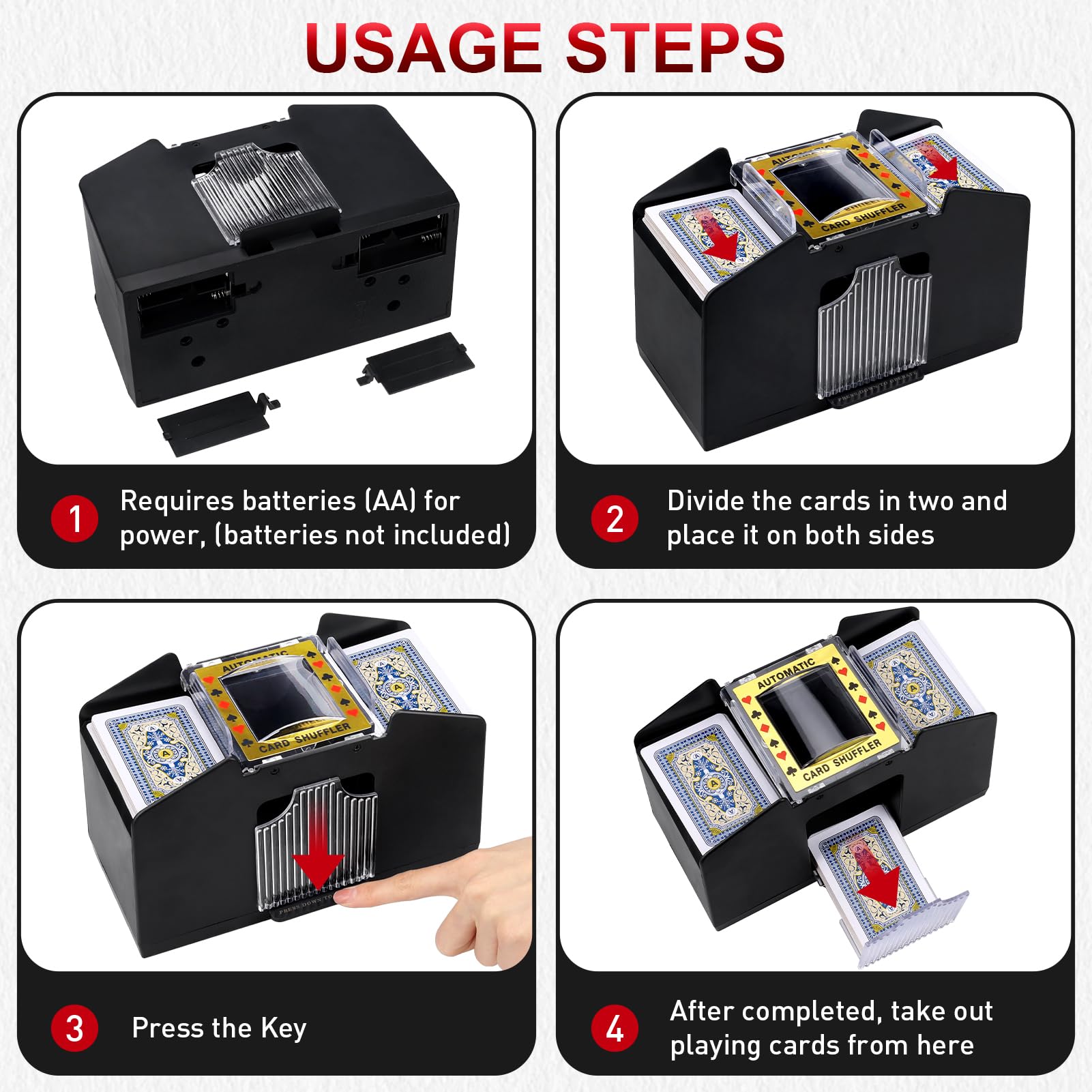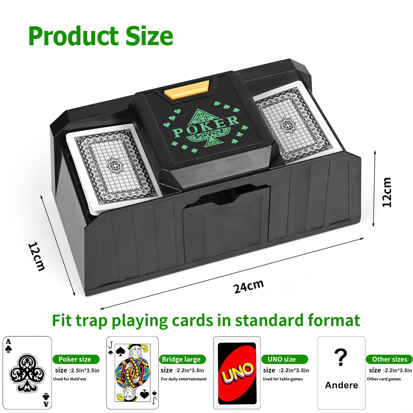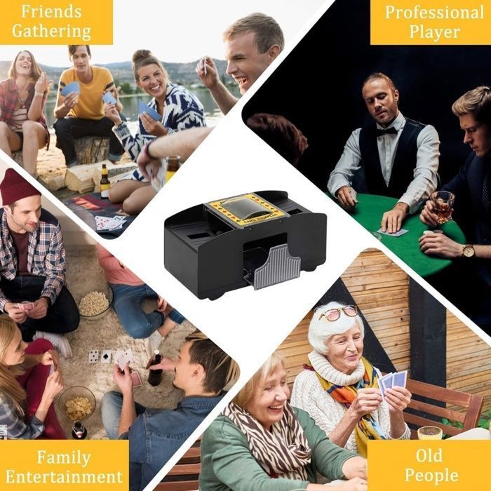 Idéal pour la maison, les voyages ou les soirées jeux. Mélangeur De Carte Skyjo Melangeur De Carte Électronique, Mélangeur De Cartes à Jouer Mélangeur Cartes Silencieux Description du produit Nos mélangeurs de cartes motorisés vous permettront de jouer en toute tranquillité ! Mélangeur De Carte Apritsce Électronique, s à Jouer à 2 Plats Spécifications Matériel : ABS Taille du Paquet : 19×15×9 cm Poids : 560g Contenu du colis 1 x Mélangeur de Cartes Avertissement De Sûreté Non Le bruit de fonctionnement est inférieur à 65 dB. Batterie rechargeable de 2000mAh]Elle offre une performance de batterie exceptionnelle, capable de mélanger 1000 jeux de cartes avec une seule charge... Batterie de grande capacité, compacte et portable. Caractéristiques Vous pouvez arrêter le mélange manuellement ou par détection automatique. 【3】Convient à tous les types de cartes : Notre mélangeur de cartes n'est pas seulement adapté au poker, mais également aux cartes standard telles que le bridge, le Skip-Bo, l'UNO et les Exploding Kittens. Veillez à ce que l'interrupteur soit allumé avant d'utiliser l'appareil ! Compatible avec de nombreux types de cartes. (Largeur maximale : 9,6 cm pour des cartes sèches et non endommagées)