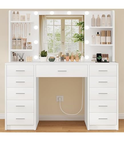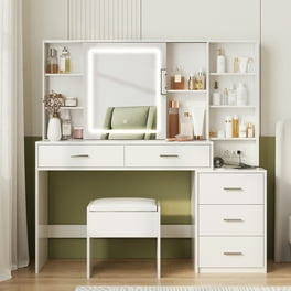 Coiffeuse avec tabouret, miroir hd et lumières led réglables, prise de courant et usb, blanc Espace de rangement suffisant : Marre des produits de beauté encombrés ? Notre coiffeuse est là pour vous aider ! Coiffeuse Complète Tabouret Inclus Mercer41 Ensemble De Coiffeuse Avec Miroir à DEL Et Prise De Courant, Coiffeuse Avec Tiroirs Et Armoire Pour Chambre A Coucher Salle De Bain C112449801 Coiffeuse Maquillage Idéale pour le maquillage à domicile, en salon et en direct, elle vous permettra de vivre une expérience de maquillage digne d'une star. Wrought Studio Coiffeuse Kallitsa avec miroir lumineux à DEL et prise de courant & Reviews... Coiffeuse avec miroir 80x40x138.5 cm - avec tabouret - avec éclairage LED - avec prise USB... Design élégant : avec un grand miroir, un charme rustique et une taille parfaite, cette table de maquillage sera un cadeau idéal pour les femmes de tous âges, elle ravira à coup sûr votre petite amie, épouse, mère ou fille ; tous vos essentiels de beauté seront organisés Avec ses 9 tiroirs et ses 4 étagères, elle offre un espace de rangement généreux pour tous vos produits de beauté, pour un espace maquillage organisé et bien rangé. Expérience satisfaisante : Le meuble de toilette est livré avec toutes les pièces, des instructions détaillées et les outils, le tout parfaitement emballé. Avec ses 3 modes de couleurs (chaud/naturel/froid) et sa luminosité réglable, elle répond à tous vos besoins. Elle est équipée d'un panneau rabattable, que vous pouvez ouvrir ou replier pour gagner de la place. 3 options d'éclairage éclatantes : la coiffeuse est équipée d'un miroir HD et de 10 ampoules LED Hollywood en plastique.