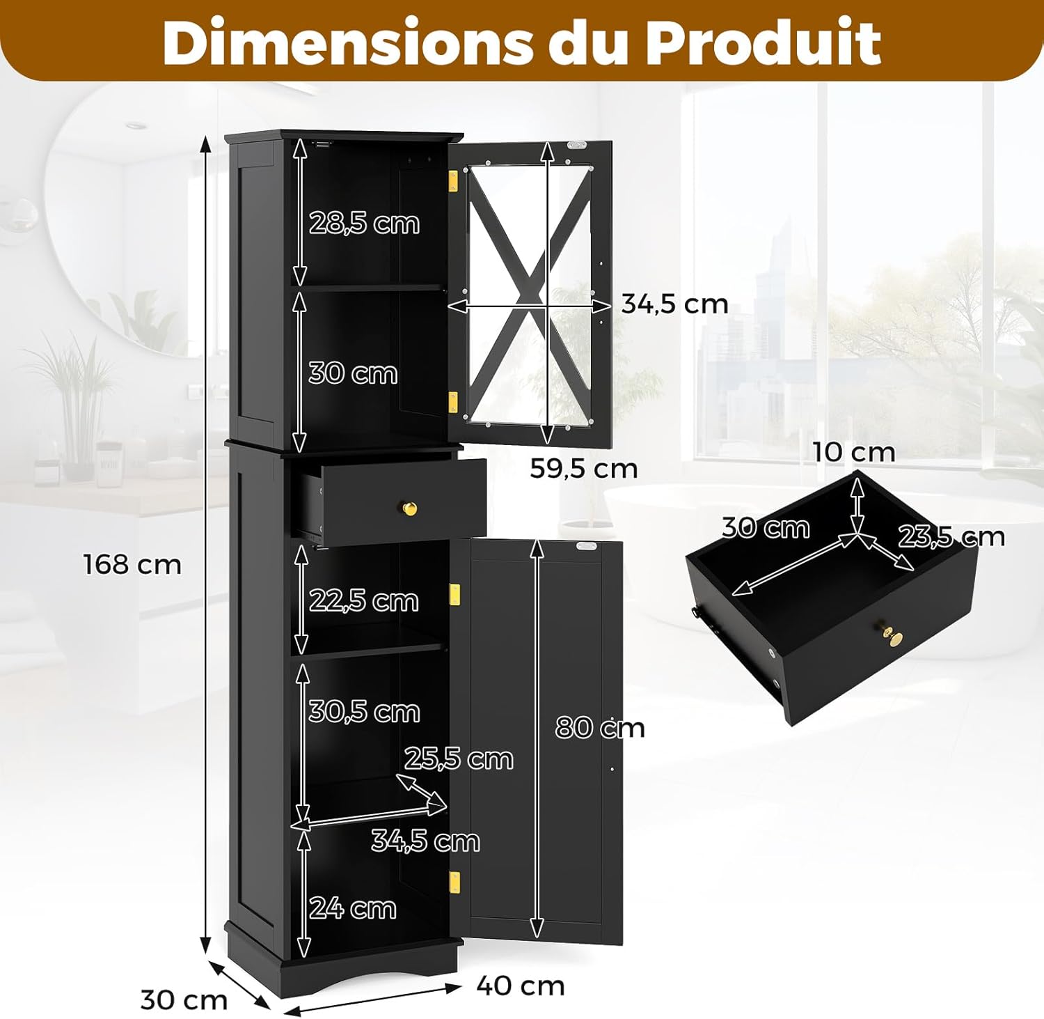 Le design moderne s'intègre facilement dans n'importe quel intérieur Les bords surélevés empêchent les objets de tomber. Armoire Salle De Bain étroite Meuble De Salle De Bain - Meuble De Rangement Avec Porte Panier Et étagère Réglable En Mdf - 66,6x29,8x86,5 Cm - Blanc étagères Réglables Qu'il s'agisse de bouteilles plus grandes ou de petits ustensiles, les étagères réglables offrent flexibilité et polyvalence. Convient aux espaces restreints : cette armoire de salle de bain d'angle de 18 x 19,5 x 80 cm est spécialement conçue pour être placée dans les coins ou à côté de vos toilettes. Étagères réglables : les 2 étagères de l'armoire peuvent être ajustées de 3 cm pour accueillir des objets de différentes tailles. Design sûr : pour assurer la stabilité et la sécurité, le meuble à papier toilette est équipé d'un système anti-basculement qui l'ancre fermement au mur. Blueoceannow Meuble-lavabo de salle de bain moderne 18 avec lavabo L'armoire de salle de bain est conçue avec un accent sur la stabilité et est équipée d'une sécurité anti-basculement pour assurer la sécurité pendant l'utilisation. Caractéristiques : Couleur : noir/gris/blanc Matériau : bois Dimensions (L x l x H) : 18 x 19,5 x 80 cm., Poids net : 5 kg. Sécurité anti-basculement pour plus de sécurité et de stabilité. L'armoire à portes simples dans la partie inférieure permet de ranger du papier toilette de rechange et d'autres accessoires de salle de bain. Grâce à son design simple mais élégant, il s'intègre harmonieusement dans différents styles d'intérieur. Pratique, il combine 2 étagères ouvertes et une armoire fermée équipée d'une tablette réglable, offrant un rangement organisé pour vos serviettes, produits d'hygiène, papier toilette et autres essentiels Lark Manor™ Armoire de rangement haute et étroite avec portes et... L'armoire multifonction est équipée de compartiments de rangement supérieurs et centraux pour un accès facile aux objets fréquemment utilisés, tandis que l'armoire fermée cache l'encombrement et assure l'ordre. 6 raisons de choisir notre armoire de salle de bain: Les armoires à papier toilette étroites s'adaptent parfaitement aux coins et aux angles. 1 x manuel d'utilisation (français non garanti). Cette élégante armoire à papier toilette est conçue pour les petits espaces et a un design simple qui s'intègre parfaitement dans vos meubles.