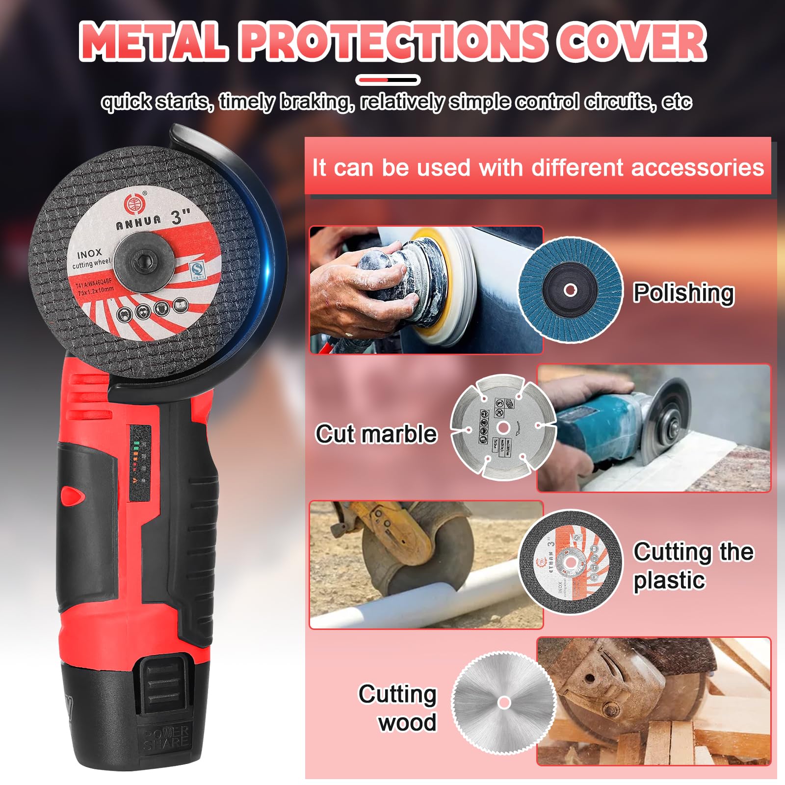 Une dissipation efficace de la chaleur protège le disque contre la surchauffe et prolonge la durée de vie de la machine. Performance de batterie longue durée - Cette meuleuse sans fil est alimentée par 2 batteries au lithium de 3000 mAh et offre suffisamment de puissance pour de longues périodes d'utilisation. Légère et portable et polyvalente : la meuleuse d'angle a une poignée ergonomique en silicone antidérapante, également très adaptée pour une utilisation à une main. Sécurité et durée de vie plus longue : le design épais réduit les éclaboussures de débris dans la machine et augmente la sécurité. Metabo 602371840 Meuleuse d'angle sans fil Vous pouvez travailler en toute confiance car la sécurité et la durabilité sont les priorités absolues avec cet outil. Que vous soyez un professionnel ou un bricoleur, cette meuleuse d'angle est un outil électrique de haute qualité pour vos travaux de coupe et de meulage. Les 2 batteries 3000mAh 16.8V offrent une autonomie longue durée, avec écran LCD pour surveiller le niveau. Le kit comprend 7 disques de coupe de 76mm pour... C'est pourquoi nos meuleuses d'angle sans fil sont livrées avec une garantie d'un an, de sorte que vous pouvez acheter en toute conscience. Son moteur sans balais puissant et durable offre une forte performance, adapté pour les meules avec un diamètre extérieur de 75 mm x 10 mm. La meuleuse d'angle dispose d'un écran LCD qui vous permet de vérifier le niveau de la batterie à tout moment tout en travaillant afin de ne pas manquer une charge. Meuleuse Angle Sans Fil Meuleuse D'angle Sans Fil TOTAL | TAGLI211542 - Déco Outillage Kit Meuleuse Avec Disques Métal Bois Pierre Le moteur de puissance garantit des performances élevées et une vitesse maximale de 28000 tr/min. Que vous soyez un professionnel ou un bricoleur, cette meuleuse d'angle à batterie est un outil électrique de haute qualité pour vos besoins de coupe et de meulage Cette mini meuleuse d'angle est adaptée pour le bois, la pierre, les carreaux de céramique, l'acier, etc.