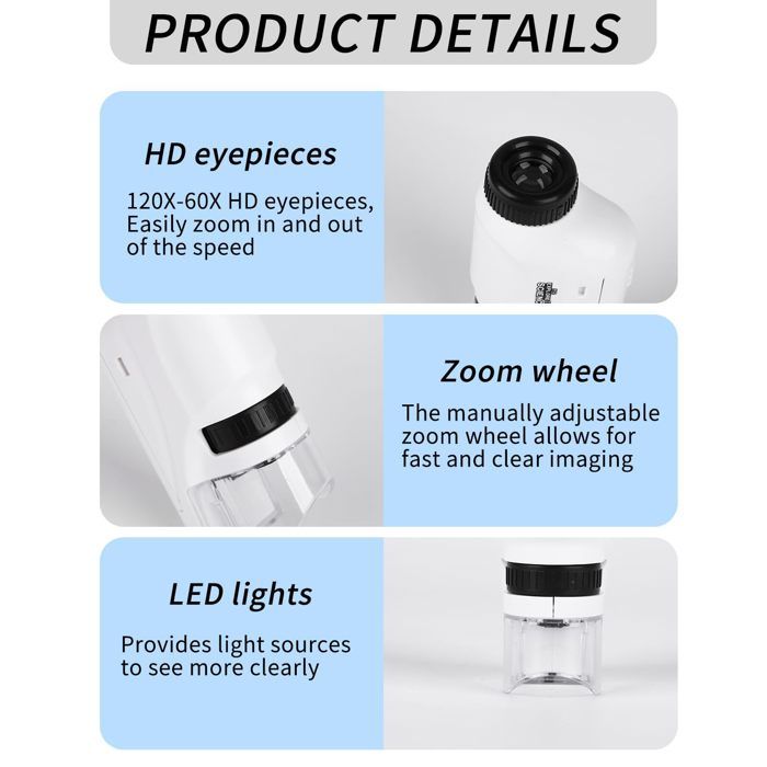 Que ce soit pour un enfant, un ami ou comme outil pédagogique, c'est le cadeau parfait à la fois amusant et pratique ! Microscope De Poche Microscope Numérique Portable Pour Enfants: 50X-1000X Avec Support Ecran Lcd 2 Pouces Hd Photovideo Avec Timer Outil Educatif Scientifique Pour Enfants 8 12 Ans 90905395 Microscope Numérique écran 2 Pouces C'est un outil pratique pour enregistrer et documenter le cycle de vie des plantes. Les lumières LED intégrées éclairent tout ce que vous regardez de près et le niveau de luminosité est réglable, le microscope est facile à utiliser et offre des heures de plaisir pour les enfants 🍀2MP et 200-1000X : il a des pixels d'objectif de 2MP avec 4 niveaux de réglage et un zoom zoom jusqu'à 1000x. Enregistrement et stockage multifonctionnels : peut prendre des photos et des vidéos et stocker jusqu'à 400 photos dans l'appareil. Microscope numérique 1000X - SALUTUYA - Écran LCD 4,3 pouces - Zoom HD... Design léger et portable avec kit de décoration d'écran amovible et corde de suspension de 50 cm, pratique pour observer et étudier à tout moment et n'importe où, un assistant pédagogique pratique. Appréciez le merveilleux monde microscopique avec un microscope à main et rendez l'exploration scientifique plus intéressante et plus pratique Idéal pour les adultes, les étudiants et les jeunes explorateurs, il favorise l'interaction entre les parents et les enfants, ainsi qu'entre les enseignants et les élèves. Mini microscope portable pour enfants - blanc 🌻Microscope numérique portable : ce mini microscope est un outil idéal pour les enfants passionnés de science pour explorer le monde microscopique. 🍁Choix de cadeau scientifique créatif : découvrez les merveilles du monde microscopique avec le microscope à main qui rend l'exploration scientifique vivante et amusante.