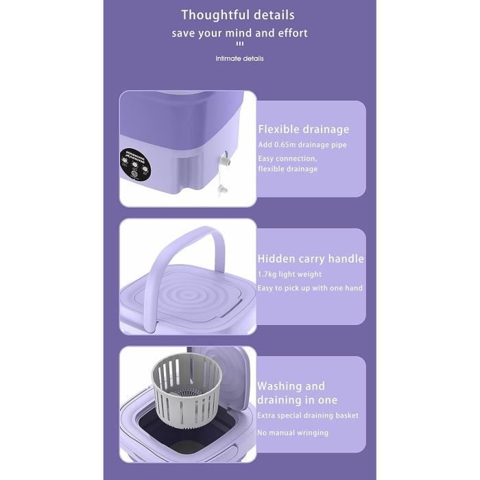 Machine A Laver Portable Mini Machine à Laver Portable PENO 3L Machine à laver portable Mini machine à laver pliable Petite machine à... Machine à Laver Camping Mini Machine à Laver, Portable Machine À Laver Sans Fil Lavage Sous-vêtements Voyage Matériel: ABS Poids: 600g Taille d'emballage: 21., 5 * 13., 5 * 13., 5cm Méthode d'emballage: boîte de papier Puissance: 15W Tension: 3., 7v Capacité de la batterie: 3000mah Mode d'alimentation: charge USB Liste de contrôle: 1 * Mini machine à laver 1 * câble de charge USB Nettoyage par pulsation de l'eau 3D: l'utilisation d'un pulsateur rotatif combiné à la technologie d'écoulement d'eau stéréoscopique 3D, simule l'action de lavage à la main, décompose efficacement les taches tenaces telles que la transpiration, l'huile et d'autres, convient particulièrement au nettoyage des sous - vêtements, des vêtements de bébé, des vêtements de sport et d'autres tissus délicats, nettoie et prend soin des fibres textiles en même temps. Machine À Laver Portable, Mini Machine À Laver Pliable, Mini Lave-Linge... Charge USB, batterie de grande capacité: batterie au lithium 3000mah intégrée, prise en charge de la charge USB, peut effectuer plusieurs tâches de lavage après le remplissage. Économisez de l'espace et rangez facilement: l'ensemble de la machine ne pèse que 600g et a des dimensions compactes (21,5 × 13,5 × 13,5 cm) avec une poignée pliable et un design modulaire qui se glisse facilement dans le coffre ou le sac à dos. Les composants peuvent être amovibles, faciles à rincer et à sécher après le lavage, évitent les mauvaises odeurs et sont faciles à entretenir. Fonctionnement ultra silencieux pour une utilisation nocturne sans tracas: conception structurelle optimisée pour la réduction du bruit, faible bruit de travail, même la nuit ou dans un environnement calme sans compromettre le repos de la famille ou l'apprentissage des colocataires, particulièrement adapté aux familles européennes et aux personnes en colocation exigeantes en termes de qualité de vie.