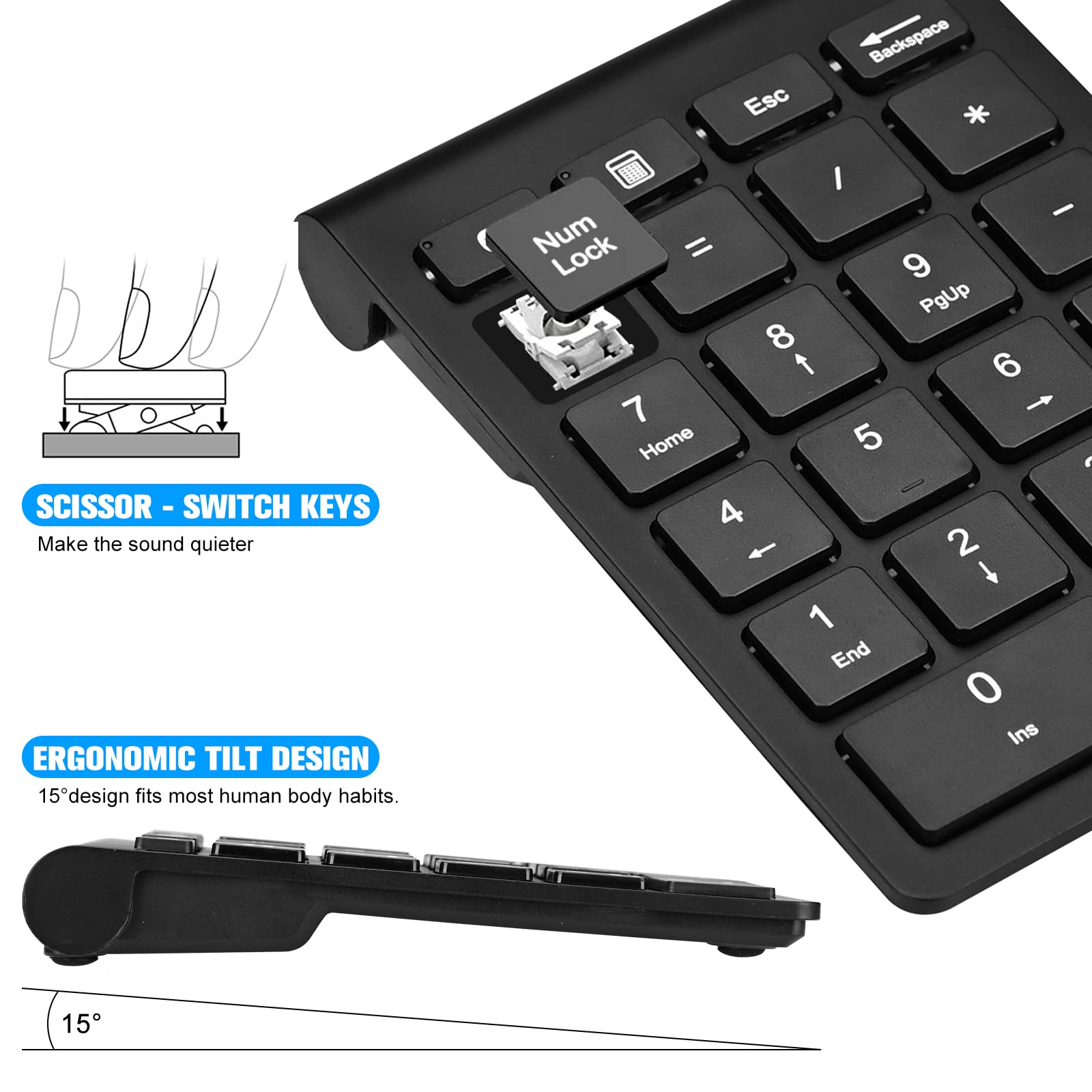 Adoptez la dernière puce Bluetooth 5., 0, fournissez une connexion sans fil et sans interférence, Combo Clavier Numérique Et Souris Sans Fil À 22 Touches, Portable Ultra... [Pavé numérique multifonction avec 22 touches] Avec 22 touches pleine taille (interrupteurs à ciseaux améliorés et boutons muets), prend en charge 0 à 10 touches numériques, +, -, *, /, plus NumLock, ESC, PgUp, PgDn, Remarque : en raison de la réflexion de la lumière et des écrans, la couleur présentée sur les photos et celle du produit réel peuvent être légèrement différentes. Pavé Numérique Bluetooth Sans Fil Mini Pavé Numérique Sans Fil Bluetooth à 22 Touches, Pavé Numérique USB, Petit Clavier Pour Ordinateur Portable, Ordinateur De Bureau, PC, Compatible Android/Win/iOS Connexion Bluetooth 5.0 10 Mètres Pas de retard ni de panne, transfert de données , portée jusqu'à 10 mètres. Daijianbin Le pavé numérique compact sans fil est parfait pour , le bureau, les voyages, les voyages d'affaires et plus encore. Le clavier numérique Bluetooth multifonctionnel est idéal pour les comptables pour traiter Excel, les enseignants, pour taper, les employés de bureau, pour saisir des données, etc. [Design élégant, portable et ergonomique] pavé numérique Bluetooth à 10 touches ne pèse que 93 g/0,2 lbs, 5,2 x 3,46 x 0,27 ; léger et portable. Il suffit de glisser ce clavier Bluetooth fin dans votre sac d'ordinateur portable, votre , votre valise ou votre sac sans prendre de place. Contenu de l'emballage : 1 clavier numérique Bluetooth. Ce clavier numérique Bluetooth rechargeable peut fonctionner jusqu'à 120 heures sur une seule charge. cimetech Bluetooth Numérique Clavier, Mini Pavé Numérique sans Fil... [Large compatibilité] Le clavier numérique Bluetooth fonctionne avec les ordinateurs portables, les ordinateurs, Pro/Air, Pro, iOS, Android, etc., Matériau : plastique., Couleur : noir. L'inclinaison ergonomique intégrée assure une sensation de frappe agréable et fluide et réduit le stress. Pavé Numérique - Achat Clavier Numérique