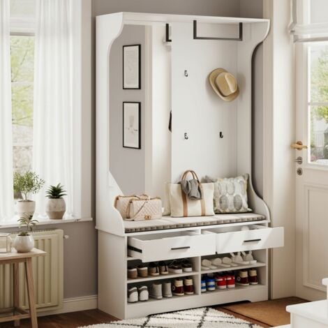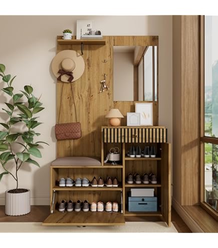 Armoire multifonctionnelle : cette garde-robe compacte dispose d'un design multifonctionnel pour optimiser l'espace. Smile Ensemble de garde-robe 1 étagère, 1 tringle à vêtements, 1 pliant, 1 portes, 1 tiroirs finitions Matera gris, chêne tabac Forte capacité de charge, charge maximale de 50 kg, robuste et durable, longue durée de vie. Meuble Entrée Multifonction 180 Cm Ensemble De Garde-robe Avec Miroir, Ensemble De Garde-robe De Armoire D'entrée Vérifiez avant l'achat si vous pouvez accepter ces légères variations de couleur et commandez avec précaution. Et aide à garder la chambre propre et bien rangée. Ensemble de garde-robe élégant dans des couleurs blanc et bois avec miroir, armoire à chaussures, banc à chaussures avec crochet et tringle à vêtements... Montage facile : nous fournissons des instructions de montage détaillées et les accessoires d'installation nécessaires. Design simple et élégant : cet ensemble de garde-robe dispose d'une finition blanche brillante, combinée à des tons de bois, simple et moderne, créant une atmosphère lumineuse et chaleureuse, associée à des poignées en métal doré, beau et unique. Dimensions et détails du produit Dimensions : 100 × 38 × 180 cm (L × l × H) Matériau : Miroir MDF aggloméré Couleur : Zwart et Couleur Bois Capacité de... L'armoire à chaussures offre de la place pour 8 à 12 paires et assure ainsi une entrée propre et bien rangée dans votre chambre. L'armoire dispose également de tiroirs de rangement et d'une armoire à chaussures qui est parfaite pour ranger de petites pièces et des chaussures. Un grand miroir à l'avant de l'armoire offre non seulement un moyen pratique de jeter rapidement un coup d'œil à l'extérieur, mais donne également à l'armoire une touche moderne et élégante. Si vous avez quelque chose, veuillez le mettre dans un endroit ventilé pendant environ une semaine et l'odeur sera atténuée., 2., Veuillez mesurer votre espace et votre taille avant d'acheter. Design banc à chaussures : ce porte-manteau de couloir avec espace de rangement est également équipé d'un banc de changement de chaussures dont le coussin doux rend les chaussures plus faciles et plus confortables et vous offre une sensation agréable à porter.