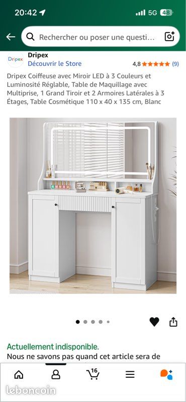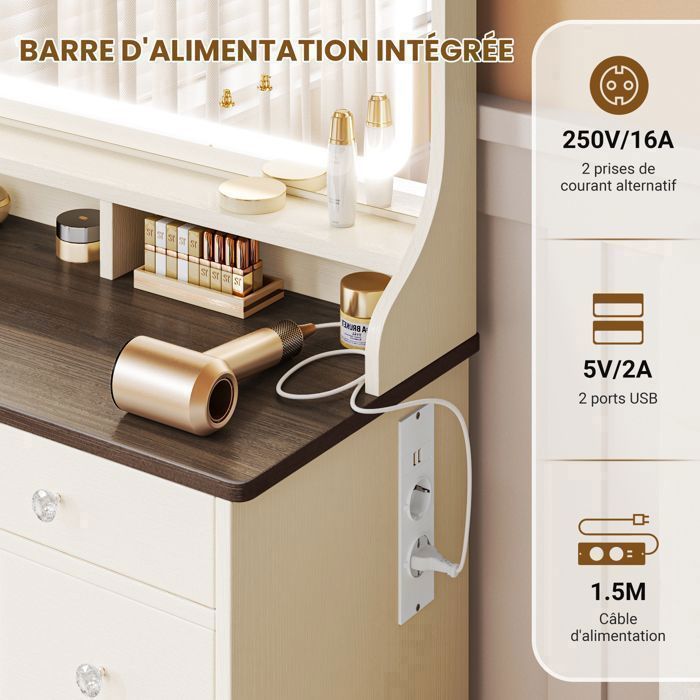 1 espace de rangement 2 11 tiroirs Grand miroir avec 3 modes d'éclairage : la coiffeuse avec miroir dispose d'un miroir surdimensionné et d'un design simple et élégant qui s'adapte à de nombreux styles d'intérieur et souligne la structure de la pièce. Station de recharge intégrée : la coiffeuse est équipée de 2 prises secteur et de 2 ports USB, idéaux pour recharger votre téléphone portable, votre smartwatch ou pour faire fonctionner des appareils de coiffure tels que des fers à friser. Le plus beau cadeau de Sabine Coiffeuse avec miroir lumineux LED dimmable, coiffeuse moderne avec 5 Glissières à roulement fluide La coiffeuse préférée de Maria Coiffeuse avec Grand Miroir à Lumières LED,11 Tiroirs,Prise de Courant USB Ports, Table de Maquillage Blanc Moderne,110x40x135cm. 4,2 / 5. 9 avis. Points forts... Si vous avez des questions ou des problèmes, n'hésitez pas à contacter notre service clientèle - nous vous fournirons une solution rapide et satisfaisante Description du produit Dripex Coiffeuse avec éclairage Coiffeuse Moderne avec 11 tiroirs La coiffeuse dispose d'un éclairage à intensité variable avec trois options de couleur : blanc froid, blanc chaud et jaune chaud. Coiffeuse Sans Miroir Coiffeuse Élégante Avec Miroir LED à Luminosité Réglable,Dressing Miroir Coiffeuse 110cm 3 Modes Luminosité À propos de cet article Grand miroir avec 3 modes d'éclairage : la coiffeuse avec miroir dispose d'un miroir surdimensionné et d'un design simple et élégant qui s'adapte à de nombreux styles d'intérieur et souligne la structure de la pièce Montage facile : la coiffeuse est livrée avec des instructions claires et chaque pièce est numérotée, ce qui rend l'assemblage très facile et sans stress - un véritable atout pour votre maison