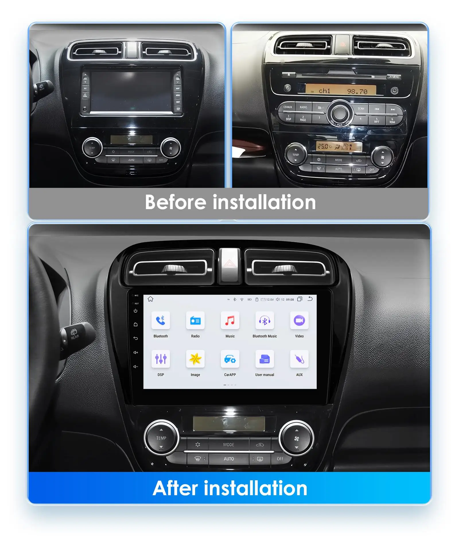 Acheter Autoradio Android Auto pour Mitsubishi Mirage Attrage 2012 Utilisez la commande vocale pour passer/répondre aux appels, naviguer, regarder des vidéos, etc. Autoradio Compatible Mitsubishi Acheter Autoradio Android Auto Pour Mitsubishi Mirage Attrage 2012 - 2018 Space Star 2014 Lecteur Multimédia Navigation GPS Stéréo HU 1 + 16GB écran 9 Pouces Android 14 Carplay Sans Fil Équipé d'une caméra de recul AHD, il bascule automatiquement sur l'image de recul lorsque vous passez la marche arrière et enregistre la circulation, rendant vos manœuvres quotidiennes plus sûres et plus confortables. CONDENSATEUR CLIMATISATION AVEC Sèche-linge pour Mitsubishi Mirage... BOSCH INSPECTION SET Filtres pour Mitsubishi Mirage/Space Star Berline... 18 présélections permettent d'enregistrer vos stations préférées pour écouter les actualités, les informations trafic, la musique et les programmes à tout moment. améliorant ainsi la sécurité de votre conduite. Vous pouvez également télécharger d'autres applications depuis le store (Waze, YouTube, TikTok, etc., ). [Écran tactile HD de 9 pouces] : Cet autoradio Android 14 dispose d'un écran tactile capacitif IPS HD de 9 pouces (1280×800), avec 4 Go de RAM et 64 Go de ROM. [Bluetooth et radio FM/RDS] : L'autoradio Android prend en charge la fonction mains libres Bluetooth, le streaming musical, la lecture de musique via Bluetooth et le téléchargement automatique du carnet de contacts. Si vous n'êtes pas sûr de la compatibilité, envoyez-nous une photo de la console centrale de votre voiture et nous vous aiderons.