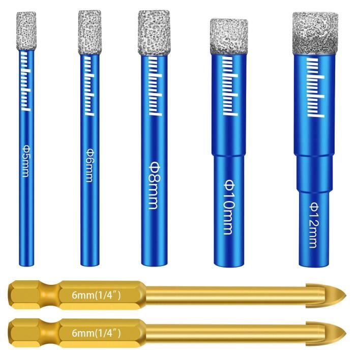 Efficace: Cet ensemble d'outils de perçage perce des trous rapidement et de manière permanente dans une variété de matériaux tels que le carrelage, le verre, le granit et le marbre. Conseils de perçage : Choisissez la vitesse de rotation et la pression appropriées, et évitez toute force excessive pour éviter d'endommager le foret et le matériau. Utilisez cet ensemble d'outils pour gagner du temps et de l'argent lors du remplacement des forets. En particulier, le foret diamant bleu contient de la cire de refroidissement qui dissipe automatiquement la chaleur, ce qui peut prolonger la durée de vie du foret. 【Matériaux de Haute Qualité】Nos forets metaux diamantés pour verre sont fabriqués à partir d'alliage de haute qualité, avec un revêtement de surface intégré pour éviter la rouille et offrir une coupe plus rapide, facilitant ainsi le perçage de l'émail dur des carreaux. Cela vous aidera à mieux utiliser cet ensemble d'outils et à obtenir de meilleurs résultats de forage. Forets Avec Cire Refroidissement 7 Pièces Foret Diamant Carrelage 3-12 Mm Forets Hélicoïdaux En Foret A Verre Meche A Carrelage Avec Tige Hexagonale Pour Verremetalbriquep 88593658 Meche Carrelage foret diamanté easyDRY BOSCH carrelage dur grès_cérame Facilité d'utilisation : Utilisez le foret jaune pour le pré-perçage, puis le foret diamanté bleu pour le perçage formel. Les travaux de rénovation peuvent être réalisés efficacement avec cet ensemble d'outils. 【Cire de Refroidissement】Les foret perceuse diamantés secs sont remplis d'un lubrifiant cire à l'intérieur, adapté au perçage à sec et à humide. Forets à Carrelage 6 mm M14 Foret Diamant Carrelage Grès Cérame Marbre - Scie cloche Diamant, 2x... ce qui le rend pratique pour les utilisateurs à utiliser dans différentes situations. 【Comment Utiliser】La procédure consiste à installer d'abord le foret jaune sur la perceuse à main, en l'inclinant à un angle de 45 degrés et en le faisant tourner rapidement sur la surface du matériau. Ils sont caractérisés par une haute résistance à la chaleur, une grande efficacité, une résistance à l'usure et une longue durée de vie. Foret Diamant À Sec Pour Carrelage 65 Mm – Scie Cloche Diamant Pour Céramique, Granit... Lors du perçage à sec, la cire fond et refroidit la surface de coupe, ou vous pouvez utiliser de l'eau pour un refroidissement supplémentaire pendant le perçage humide, prolongeant ainsi la durée de vie des foret ceramique. Il est recommandé d'ajouter de l'eau pendant le forage pour refroidir et prolonger la durée de vie des mèches. Polyvalence: Cet ensemble d'outils de perçage convient à une variété de machines, telles que les perceuses à main, etc.