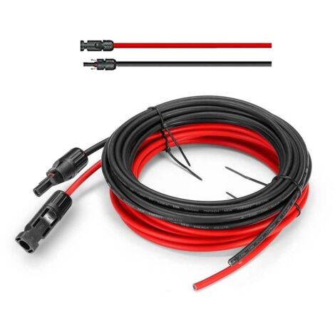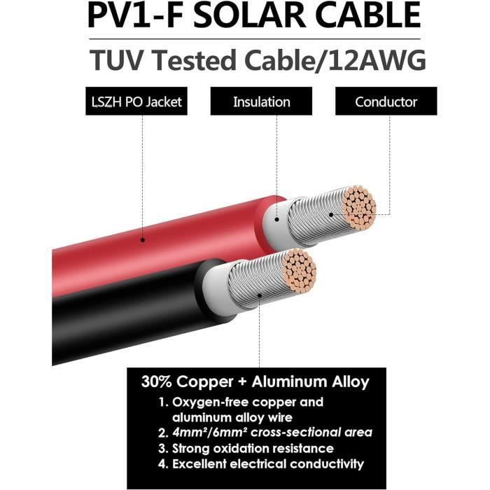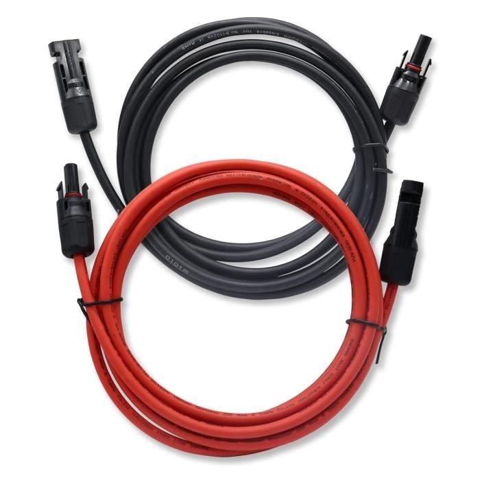 Câble solaire 6 mm² Noir KBE Solar DB Câble solaire rouge section 4 ou 6mm² pour installations solaires photovoltaïques Caractéristiques techniques : Résistance : Section 4 mm² : 5.09 mOhm/m Section 6 mm² : 3.39 mOhm/m Diamètre extérieur : Section 4 mm² : 5.4 mm Section 6 mm² : 6.0 mm Conducteur : E-Cu étamé selon IEC 60228 classe 5 Gaine extérieure : Polyoléfine réticulée spéciale 36 Shore D Sans Halogène... Câble Photovoltaïque Uv 1 Mètre Câble Solaire De 6 Mm², Rallonge De 1 M, Avec Fiches Solaires Pour Installations Photovoltaiques Resistant Aux Uv Certifie Vde Rougenoir 6 Mm21 M 6mm21m 92065294 Connecteur Solaire Résistant Intempéries Optimisez et simplifiez vos installations photovoltaïques avec notre rallonge de câble solaire de haute qualité. Conçue pour offrir une performance optimale, cette rallonge de 1 mètre est équipée de connecteurs MC4 compatibles Sunrise mâle et femelle, assurant une connexion sécurisée et fiable L'isolation en polyoléfine réticulée protège de manière fiable contre les rayons UV, l'abrasion et les températures extrêmes, ce qui assure une utilisation efficace à long terme. Câble solaire de 6 mm², rallonge de 1 m, avec fiches solaires pour installations photovoltaïques, résistant aux UV, rouge/noir, 6 mm²1 m