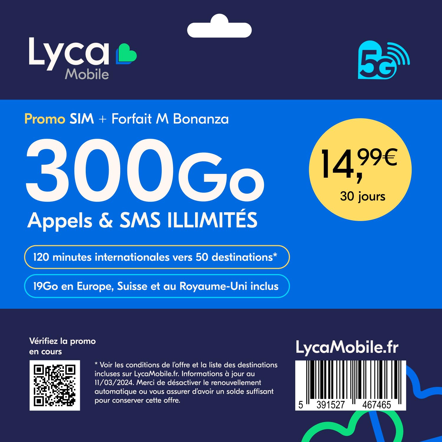 Carte Sim Prépayée Orange Mobicarte Zen - 10 Go Internet + Appels/SMS/MMS Illimités | Sans 19go Roaming Europe Suisse Uk Comment activer une carte SIM Lycamobile ? - Culture Mobile Carte SIM Free Prépayé 300Go illimité 5G | Roaming EU 120 min internationales : Vers 50 pays inclus (USA, Europe, Afrique…). Forfait Lyca M 11.99 350 GB. 350GB · 11.99 · 19GB EU, Ukraine & Moldova Roaming Data ; Forfait 250Go 5G - Lyca S plus. 250GB · 8.99 · 14GB EU, Ukraine & Moldova... Utilisation flexible : Idéal pour touristes, étudiants, expatriés et voyageurs. 300Go Internet 5G : Grand volume data pour streaming, navigation, et apps. fr, rubrique déjà avec Lyca et cliquez sur Renouveler mon forfait Sans engagement, activation simple, parfaite pour les touristes, étudiants, expatriés et voyageurs.
