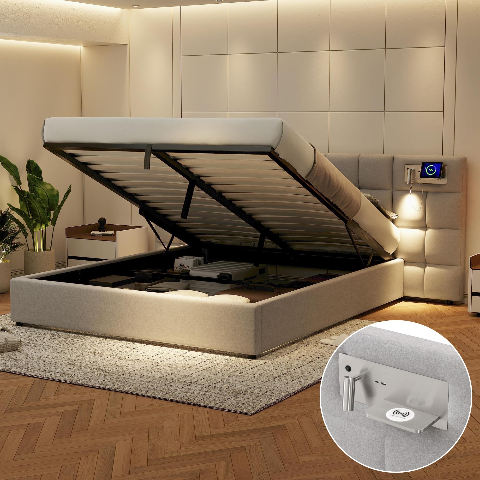 Lit Cofe 180x200 Cm - Lit Doub LED Capitonné Relevable Hydraulique Avec Sommier A Lattes Tete De Lit Simili Cuir Pu Gris 1 Taille. 180x200 ; Matériau. Métal ; Dimensions du produit. 2,14L x 1,86l x 1,13H mètres ; Style. Moderne ; Caractéristique spéciale. Éclairage LED, Port USB Lit Capitonné 180x200 Adulte Lit Capitonné Moderne 180 X 200 Cm Avec Rangement Hydraulique,tête De Lit 180x200 Cm Moderne Transformez votre chambre à coucher en une oasis de confort et de style moderne avec notre lit capitonné LED. Fonctionnalités de chargement pratique : Equipé d'un ou plusieurs ports USB, ce lit capitonné moderne vous permet de recharger vos appareils sans quitter le confort de votre lit, alliant parfaitement utilité et design. Lit Capitonné LED 180 X 200 cm - Sommier À Lattes et Rangements - Pu... Caractéristiques Techniques : - Type de produit : Lit capitonné avec tête de lit intégrée - Dimensions du lit : 180 x 200 cm - Couleur : Beige / Gris (tissu en lin texturé) - Matériaux : Tissu (lin), Métal, Contreplaqué, Panneau de fibres de moyenne densité (MDF) - Capacité de charge maximale : 250 kg Fonctionnalités Intégrées : - Éclairage LED : Bandes LED multicolores avec télécommande - Connectivité : Port(s) USB de chargement intégré(s) - Rangement : Tête de lit avec niches + Mécanisme de soulèvement hydraulique pour accéder au grand coffre de rangement - Sommier : 12 lattes en bois multi-couches pour un soutien lombair optimal - Epaisseur de matelas recommandée : 21 à 23 cm - Livraison et Montage : - Poids net du produit : 52 kg - Poids total du colis : 56 kg - Nombre de colis : 2 - Niveau d'assemblage : Assemblage complet requis (nécessite 2 personnes) - Temps d'assemblage estimé : Environ 1 heure - Outils nécessaires : Fournis dans le colis. Gain de place et rangement optimal : Maximisez l'espace de votre chambre avec de grands rangements intégrés : des niches de tête de lit et un somme à soulèvement hydraulique pour y ranger couvertures ou literie. Tissu en lin hypoallergénique et résistant : Recouvert d'un lin doux et peau-friendly, ce lit design est non seulement agréable au toucher mais aussi très durable et facile à entretenir pour une élégance longue durée. Structure robuste et soutien ergonomique : La structure en métal renforcé et le sommier à lattes multiformes garantissent un excellent soutien lombard, une stabilité durable et un sommeil véritablement réparateur.