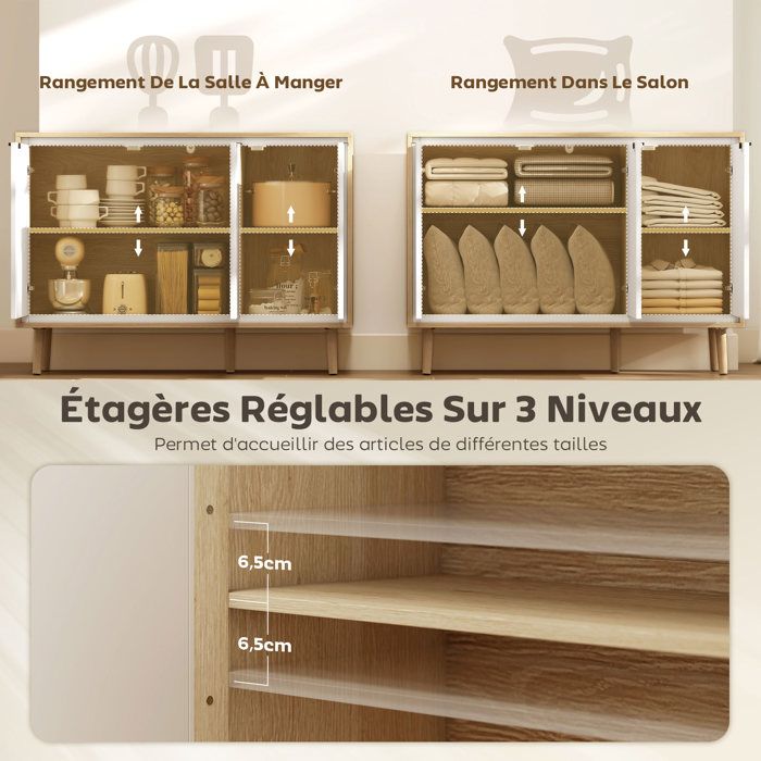 Armoire Salle à Manger étagère Réglable Buffet Salon Meuble De Rangement Style Moderne Avec Placard à 2 Portes, étagère Réglable, Pieds En Métal - Dim. 76,5 X 39 X 77 Cm, Blanc Meuble Toilette HOCO Buffet Bas euble de Rangeent sur Pieds Style scandinave - 2 Meuble de rangement HOMCOM buffet salon avec 2 placards 3 portes et étagère réglable, pieds en métal, aspect marbre noir · 107 x 35 x 75 cm 102,90 € · 76 x 35 x... recommandée : 48 kg (total), 20 kg (dessus), 10 kg (étagère), 6 kg (tiroir) ● Réf. ESPACE DE RANGEMENT SPACIEUX : Mesurant 80 x 35 x 77 cm, ce buffet dispose de trois tiroirs et d'un placard à deux niveaux, parfait pour ranger livres, jeux et indispensables du salon, contribuant à maintenir votre espace ordonné et à instaurer une ambiance accueillante et apaisante. ORGANISATION FLEXIBLE : Grâce à son étagère ajustable sur trois niveaux à l'intérieur du placard, cette armoire de cuisine permet de personnaliser le rangement de vos livres pour une utilisation quotidienne à la fois simple et agréable. Caractéristiques:● Ce buffet dispose de trois tiroirs et d'un placard à deux niveaux, maintenant votre espace de vie rangé ● Comprend une étagère réglable sur trois niveaux, personnalisant le rangement pour des objets de différentes tailles ● Façade haute brillance et cadre effet chêne de l'armoire de cuisine créent une esthétique chic et moderne ● Sert parfaitement de meuble de salon, buffet ou meuble d'entrée ● Surélevé sur des pieds de 15 cm, permettant un nettoyage facile en dessous ● Cadre en panneau de particules et MDF avec pieds en bois garantit la stabilité ● Comprend un kit anti-basculement pour la sécurité au quotidien ● Montage nécessaireSpécifications:● Couleurs : blanc brillant, chêne ● Matériaux : panneau de particules, MDF ● Dimensions totales : 80l x 35P x 77H cm ● Dimensions du tiroir : 34,5l x 29P x 10H cm (internes) ● Dimensions de l'armoire : 35l x 31P x 60H cm (internes) ● Hauteur du bas jusqu'au sol : 15 cm ● Charge max. UTILISATION LARGE : Idéal pour tout espace de vie, que ce soit le salon, la salle à manger, la cuisine ou le couloir, ce meuble de rangement optimise votre environnement et simplifie les gestes de tous les jours. Les 15 cm de dégagement permettent à un robot nettoyeur de passer facilement dessous. STABLE ET SÉCURISÉ : Constitué de panneaux de particules et de MDF, posé sur quatre pieds en bois robustes, ce meuble de rangement inclut un dispositif de sécurité anti-basculement, garantissant ainsi la tranquillité d'esprit des familles et une stabilité durable. Armoire de rangement à style moderne de luxe avec texture de marbre noir, pieds et poignée en ton or, rehausse le charme esthétique de votre maison · Un grand cabinet et un petit cabinet offrent un large espace de rangement