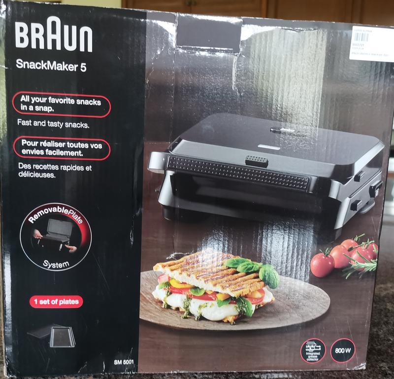 Gaufrier SnackMaker 5 - petit électroménager Braun | Braun FR Sonifer – gaufrier électrique 7 en 1, grand appareil de cuisson avec 7... Sandwich Maker Braun SnackMaker 5 Plaques Amovibles Machine À Croque Monsieur Avec Plaques Plates,Sandwich Toaster Multifonction Snack 800w Le SnackMaker 5 simplifie la préparation de collations saines grâce à deux types de plaques pour une large polyvalence : sandwich et gaufres. Puissant : 800 W de puissance pour préparer instantanément toutes vos collations préférées sans long temps de préchauffage ; kit de plaques à sandwich inclus L'appareil à sandwich et gaufrier SnackMaker 5 est parfait pour réaliser des recettes délicieuses en un clin d'oeil. Les plaques sont amovibles et compatibles au lave-vaisselle, pour un nettoyage rapide et facile. Pour des recettes plus saines, le bac à graisse intégré évacue l'excès d'huile pendant la cuisson et les plaques sont dotés d'un revêtement antiadhésif. Accessoires inclus... Les plaques facilement amovibles peuvent être remplacées par un simple clic. CONTENU DE 2 PLATEAUX À sandwich : les plaques à sandwich sont conçues pour sceller le fromage fondu et d'autres ingrédients dans votre toast grâce à leur moule à sandwich emblématique Plaques lavables au lave-vaisselle : les plaques à double revêtement de qualité supérieure passent au lave-vaisselle Gain de place : conçu pour un rangement peu encombrant, le SnackMaker 5 vous laisse plus d'espace sur votre plan de travail ou votre armoire