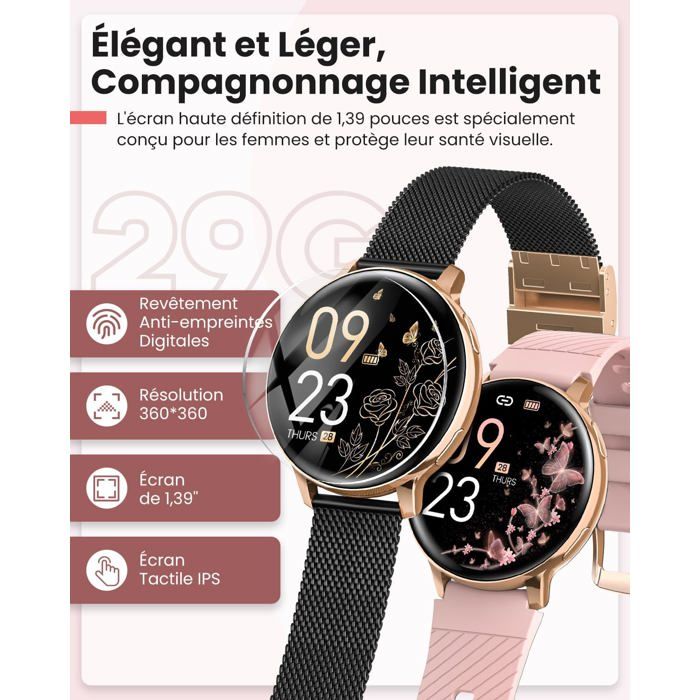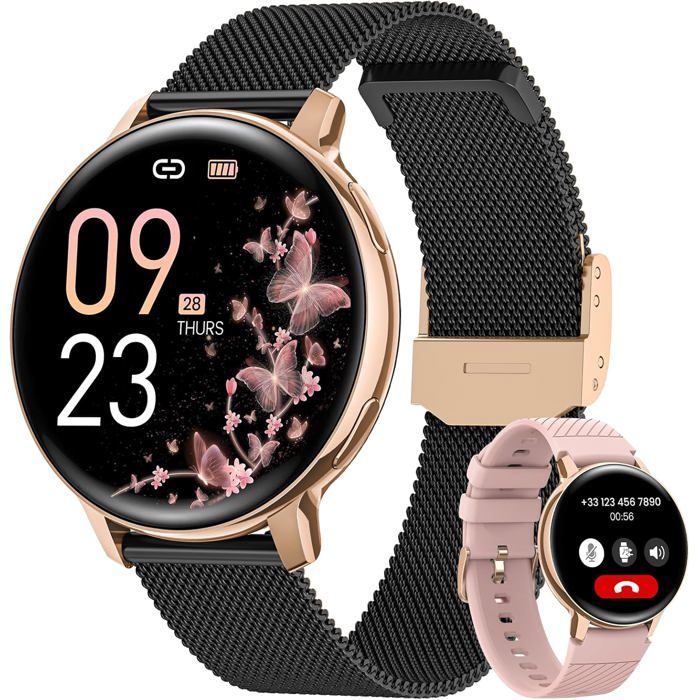 Appels Bluetooth Santé SpO2 BENYAR SMART Femme, 1,43" AMOLED Écran/Appel Bluetooth Montre Connectée [Fonctions Supplémentaires] Cette montre connectée femme intègre des assistants quotidiens : contrôle musique, réveil léger, prévision pluie, minuteur sédentarité, alarme hydratation & déclencheur selfie à distance – votre montre connectée femme pratique, compatible Android 4., 0+ et iOS 9., 0+. Test de la benyar smart : montre connectée AMOLED 1.43 étanche avec... 1 Surveillance du sommeil 2 Fréquence cardiaque 3 Surveillance d'oxygène [Sur Mesure pour les Femmes] Cette montre connectée femme offre une surveillance santé scientifiquement fondée spécifiquement pour les femmes, incluant un suivi précis du cycle menstruel et des conseils de soins par phase – avec cette montre connectée femme, vous enregistrez systématiquement vos données vitales, recevez des analyses personnalisées et un soutien technologique pour votre bien-être en tant que montre connectée femme moderne. [Assistant Santé Tous Temps] Cette montre connectée femme enregistre 24h/24 votre fréquence cardiaque, oxygénation sanguine, niveaux de stress et qualité de sommeil – les analyses automatiques de durée de sommeil, récupération et niveaux d'énergie quotidiens vous aident à gérer votre quotidien. Montre connectée femme Vidéo de marchand [Partenaire Sportif] Votre montre connectée femme vous accompagne dans plus de 120 activités comme le vélo, la course, le fitness, le yoga, le ski ou le golf – elle enregistre facilement la durée de l'entraînement, les calories brûlées et les pas, pour suivre vos heures les plus actives. [Format Compact et Personnalisation] L'écran AMOLED de 1,43 pouce de cette montre connectée femme affiche toutes vos données avec une netteté parfaite au soleil comme à l'ombre – changez parmi plus de 200 cadrans, affichez votre chien en promenade, les couchers de soleil de vacances ou des moments de fitness motivants en tant que cadran personnel de votre montre connectée femme. Recevez les notifications des SMS, WhatsApp, Instagram & autres directement sur l'écran de cette montre connectée femme – avec vibration au poignet. Découvrez Notre Test De La Montre Connectée Féminine ESFOE Avec Appel Bluetooth Et 120 Modes Sportifs